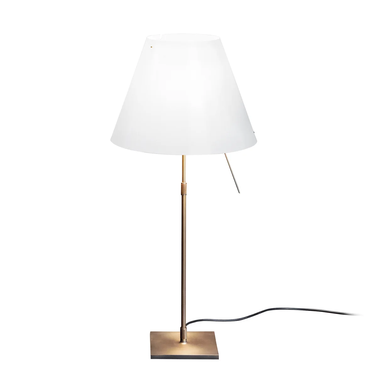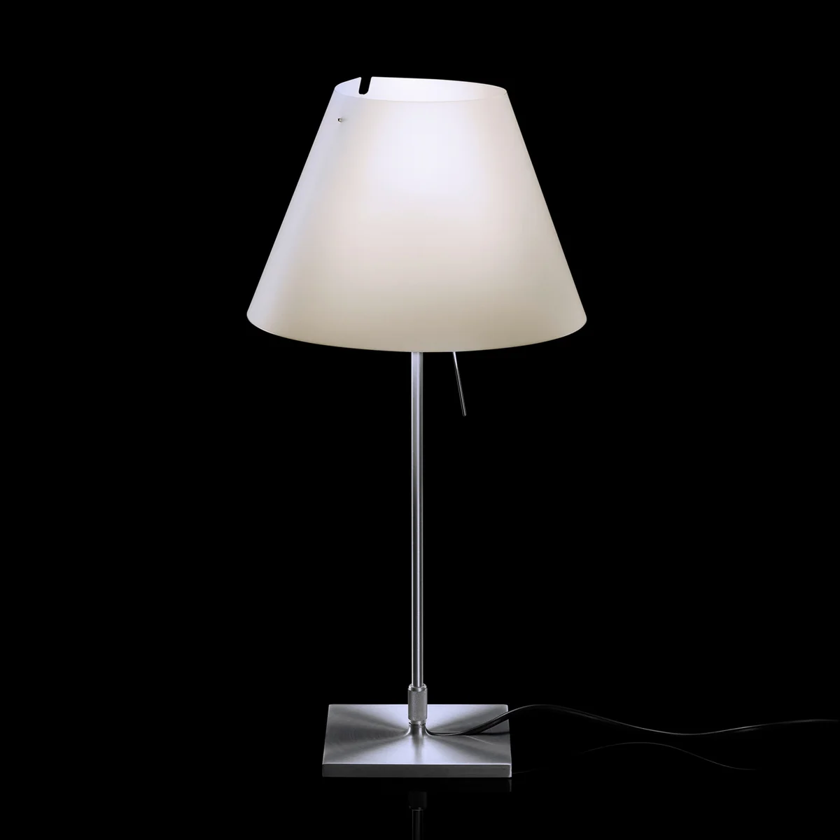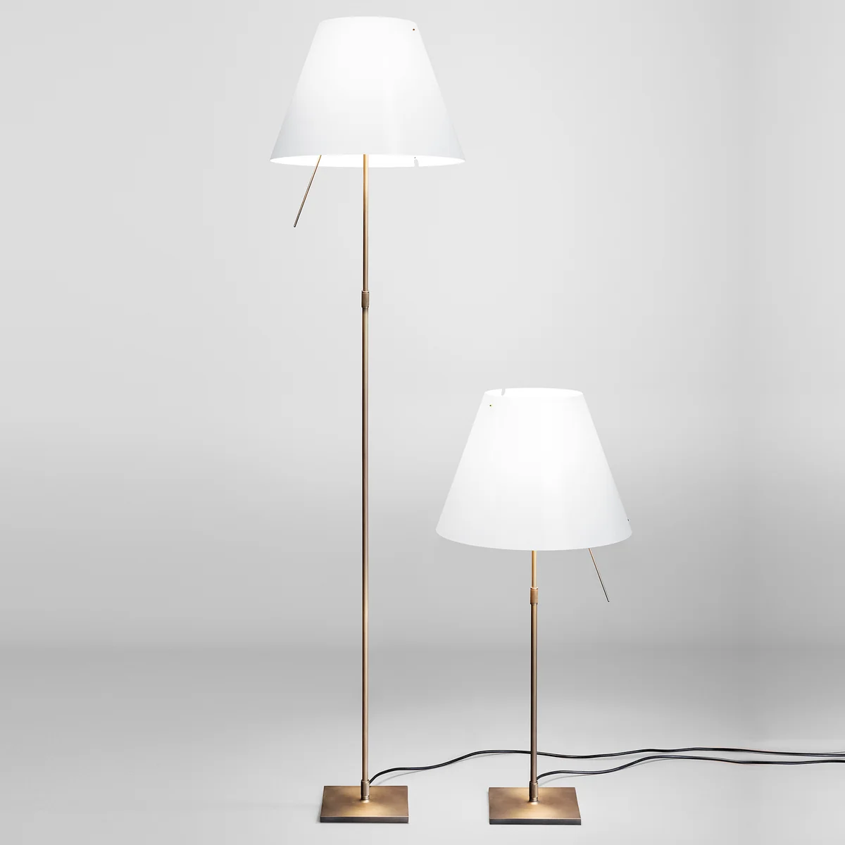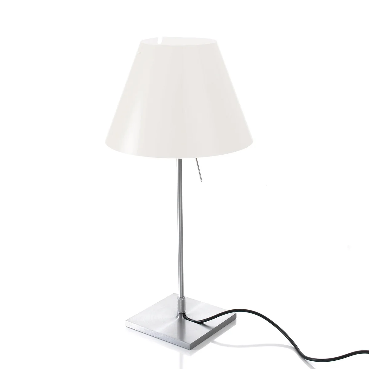 Der leichte Schirm wird ergänzt durch die schlanke und gleichzeitig solide Struktur der Costanzina Tischleuchte. Teleskopstange und Standfuß bestehen aus Aluminium. Die Leuchte von Luceplan wird mit einem Leuchtmittel mit E14-Sockel und maximal 60 Watt betrieben und besitzt einen Ein/Aus-Schalter.