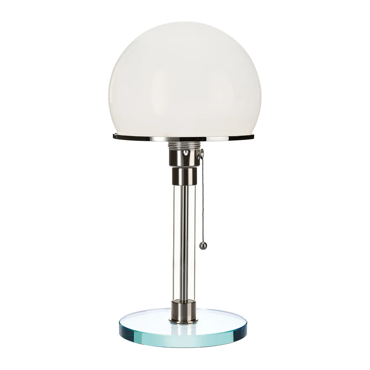 Die WG 24 Wagenfeld-Leuchte besteht aus einer opalfarbenen Glaskuppel, der Fuß und die Säule bestehen aus Klarglas und die Einfassungen aus vernickeltem Metall. Die metallenen Halbkugeln unter der Fußplatte geben der Leuchte ihre “Leichtfüßigkeit".