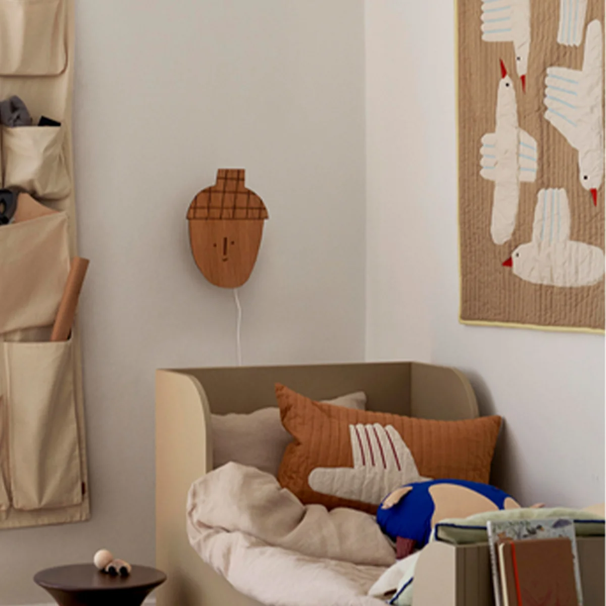Die Kinder Wandleuchte aus dem Hause Ferm Living begeistern mit ihrem natürlich, organischen Look. Sie sorgen für eine beruhigende Atmosphäre und ein überaus angenehmes, sanftes Licht. Der Leuchtenschirm wird aus geöltem Eichenfurnier gefertigt, die Details werden mit einem Laser eingraviert. Die Leuchte kann ganz simpel an der Wand direkt neben dem Bett anmontiert werden, um so ein optimales Nachtlicht zu bieten. Kombinierbar mit zwei G4 LEDs und max. 2x3 W. Die LEDs sind im Lieferumfang nicht enthalten. 1,90 m langes Kabel vorhanden.