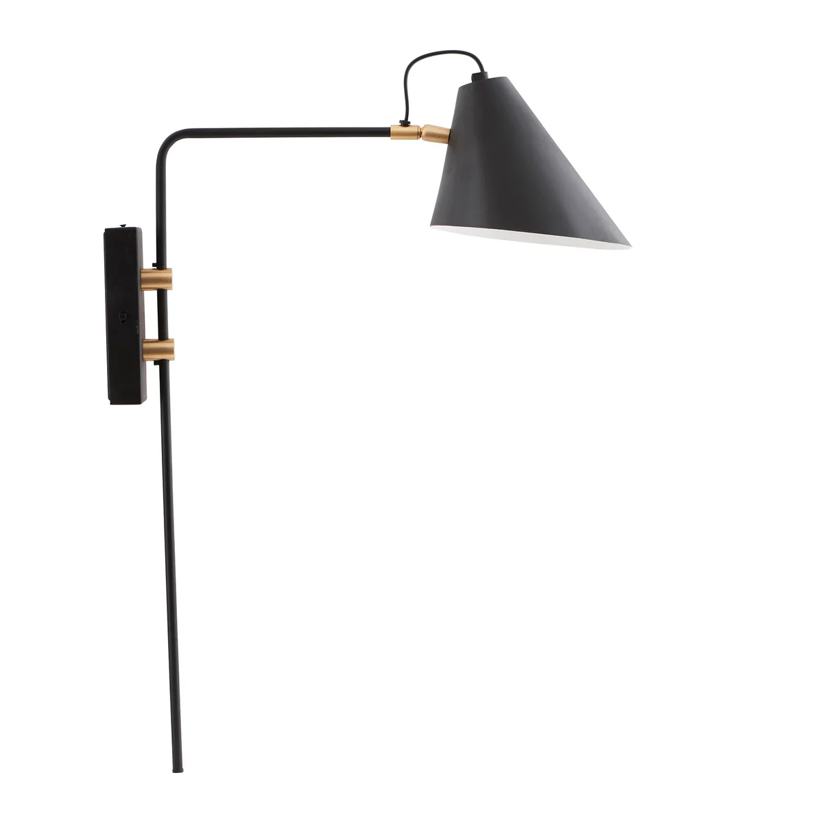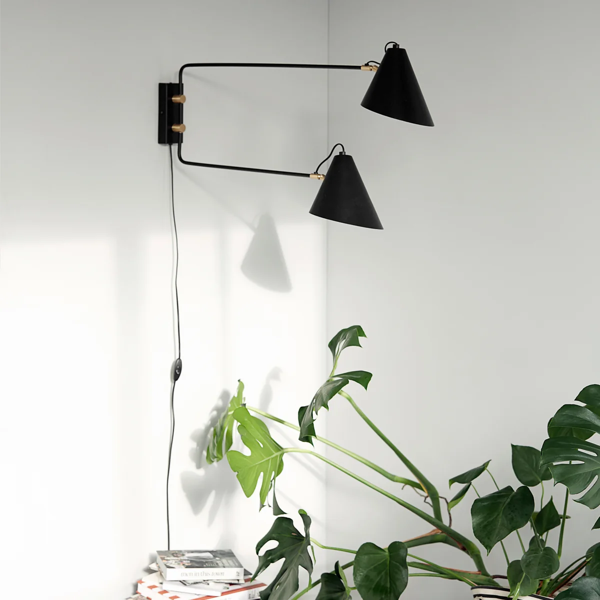Die justierbare Club Wandleuchte von House Doctor ist mit ein oder zwei Gelenkarmen ausgestattet und spendet immer genau dort Licht, wo es benötigt wird. Am Ende des Gelenkarms befindet sich ein konischer Lampenschirm aus lackiertem Eisen, der direkt nach unten gerichtetes Licht abgibt. Die Verbindungselement aus Messing setzen glänzende Akzente und heben den Industriecharme zusätzlich hervor.