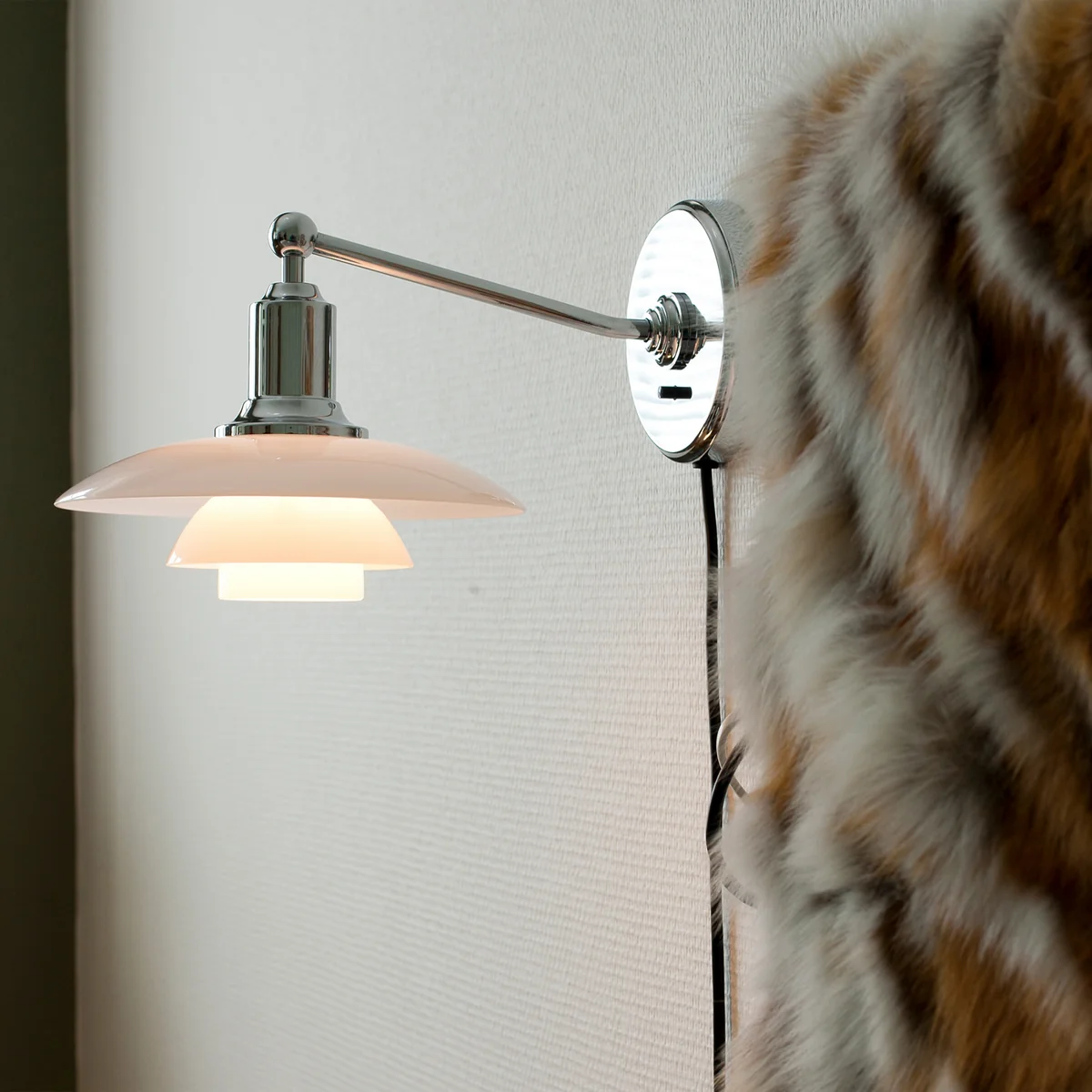 Die PH 2/1 Wandleuchte von Louis Poulsen wird aus mundgeblasenem Opalglas gefertigt, Arm und Halterung bestehen aus hochglanzverchromten Aluminium und Messing.