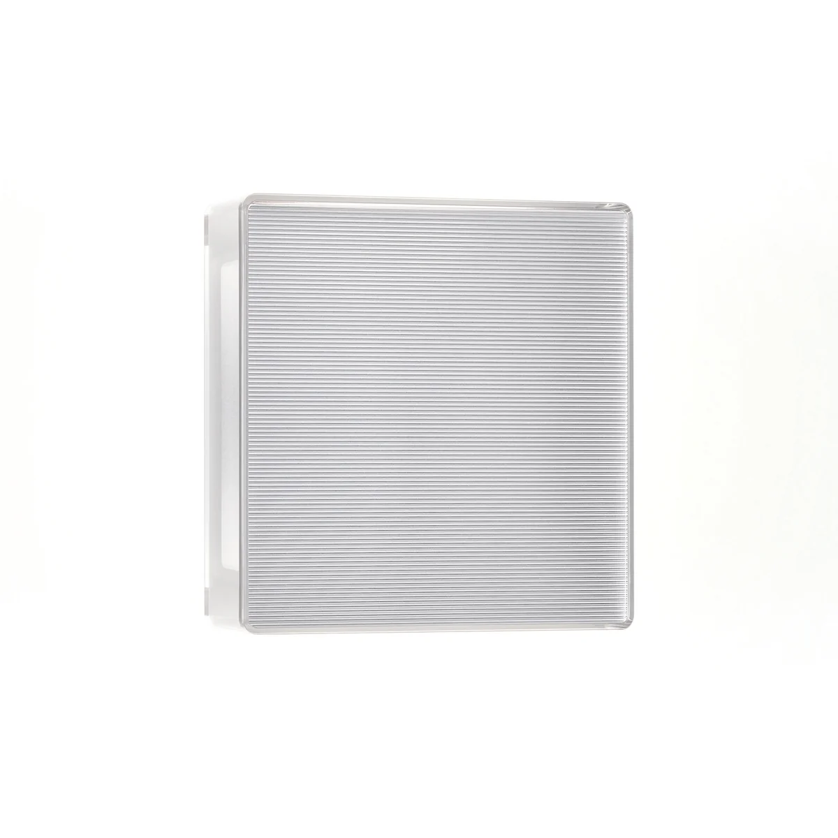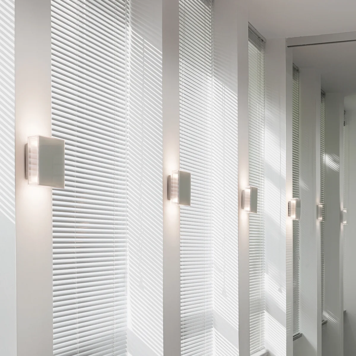 Die App Wandleuchte besteht aus einem Gestell aus Aluminium, einem Schirm aus Polycarbonat und einer Front aus Plexiglas oder Glas in vielen verschiedenen Varianten. Energieeffiziente Technik steckt in zwei lichtstarken LED-Platinen. Diese geben ein intensives Licht symmetrisch nach oben und unten ab, das über Wand, Decke und Boden in den Raum reflektiert. Das seitlich durch den Quader fallende Licht dagegen ist sanft streuend und blendfrei. Die Farbe der Frontfläche hat keinen Einfluss auf die Lichtintensität.