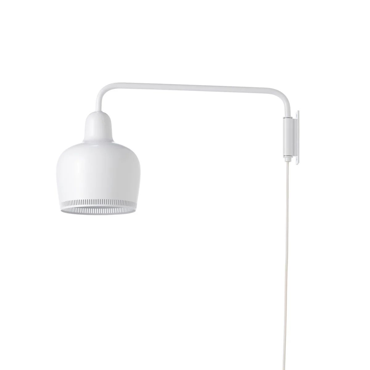 Die Golden Bell Wandleuchte besteht aus einer Wandhalterung und einem schlanken Arm, an dem der runde Lampenschirm angebracht ist. Die Perforation am Rand des 180 Grad verstellbaren Schirms sorgt für einen dekorativen Korona-Effekt und das übrige Licht wird blendfrei und diffus im Raum gestreut. Die Leuchte ist aus Messing, Chrom oder pulverbeschichtetem Stahl in Schwarz oder Weiß erhältlich.