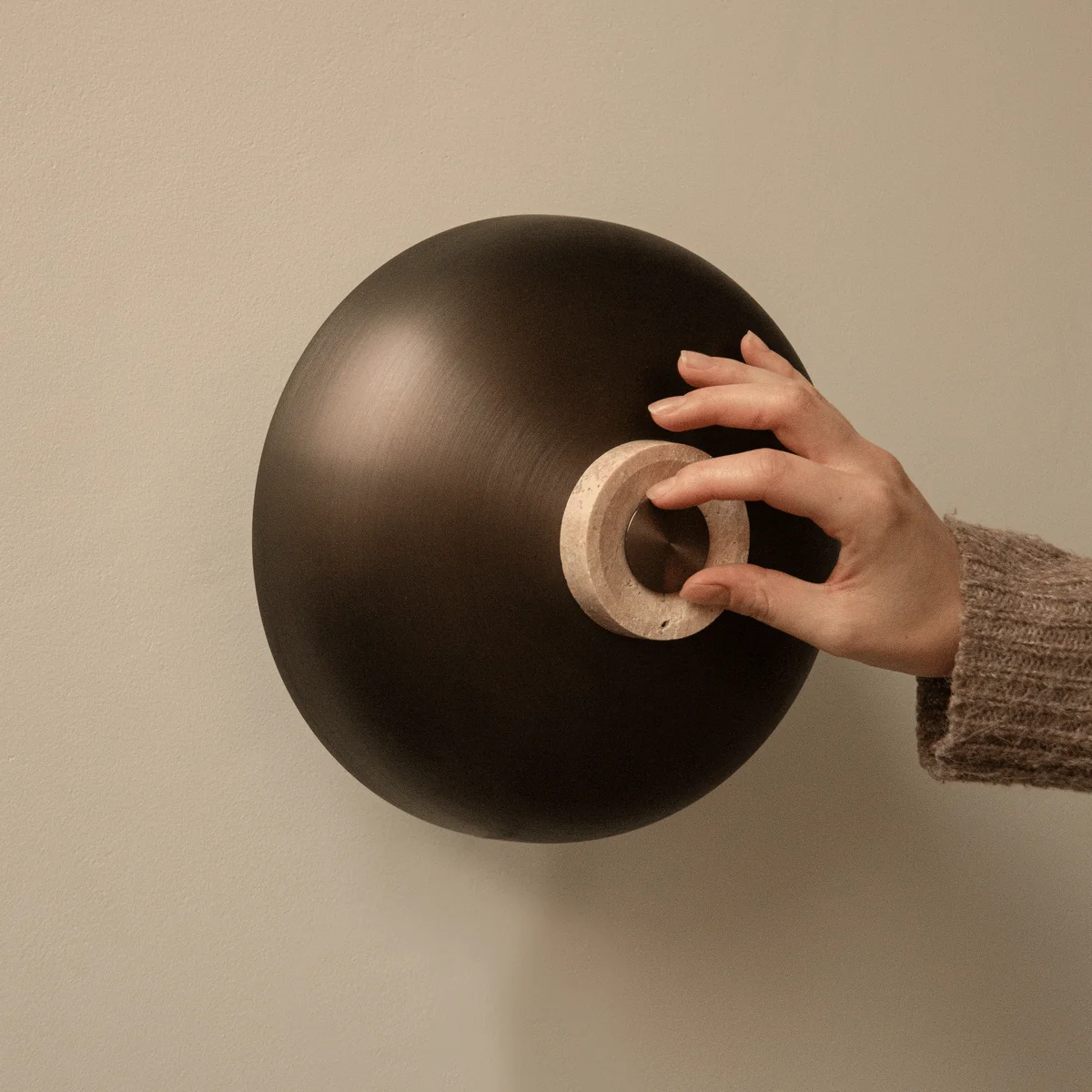 Die Reverse LED Wandleuchte von Audo verbindet rohe Naturmaterialien mit raffinierter Handwerkskunst und schafft eine Balance aus Spannung und Harmonie. Inspiriert von geometrischen Formen, besteht die Wandhalterung aus unbehandeltem Travertinstein, dessen konische Form und natürliche Unregelmäßigkeiten die Schönheit organischer Strukturen hervorheben. Im Kontrast dazu steht der geschwungene Schirm aus bronziertem, eloxiertem Aluminium mit einer glatten Oberfläche, die dem Design eine elegante Note verleiht.
