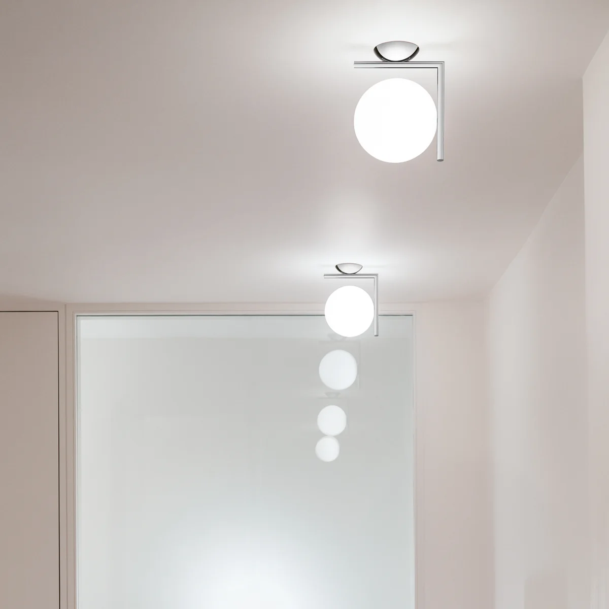 Der Kontrast aus filigranen Linien und voluminösen Leuchtkörpern, aus Metall und opalisiertem Glas, erzeugt bei der Flos IC Wandleuchte und Deckenleuchte einen ganz eigenen Charme. Das Material erinnert an vergangene Zeiten, während es formal in einen neuen Kontext gesetzt wird. Durch ihren matten Leuchtenkopf aus Opalglas fällt weiches und dimmbares Licht, das sich blendfrei im Raum verteilt und mit seiner behaglichen Art besonders für Wohnzimmer und Schlafzimmer eignet.