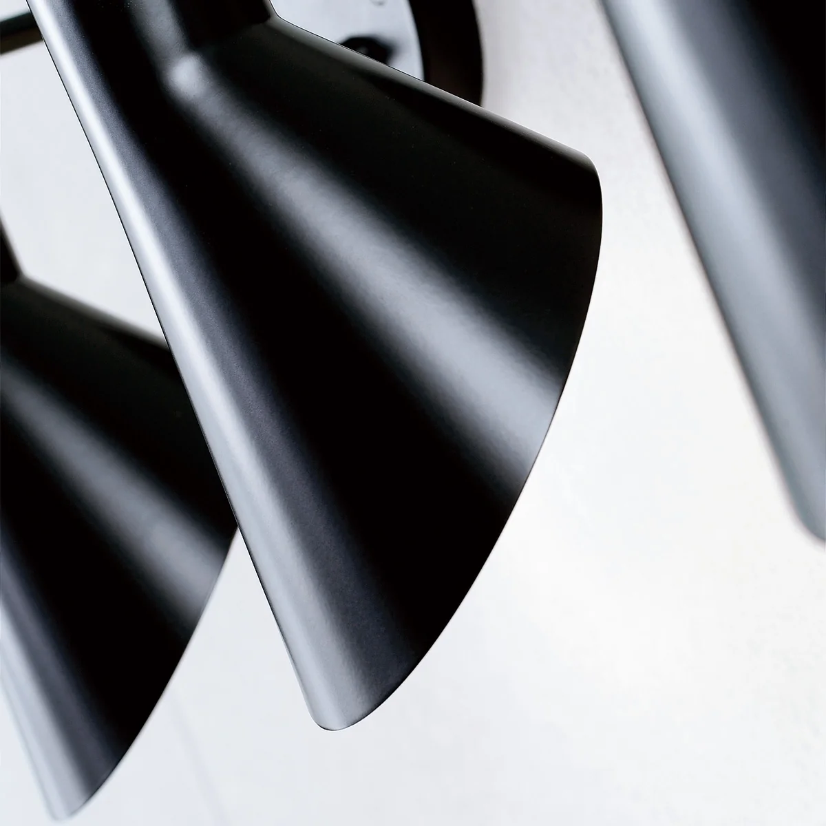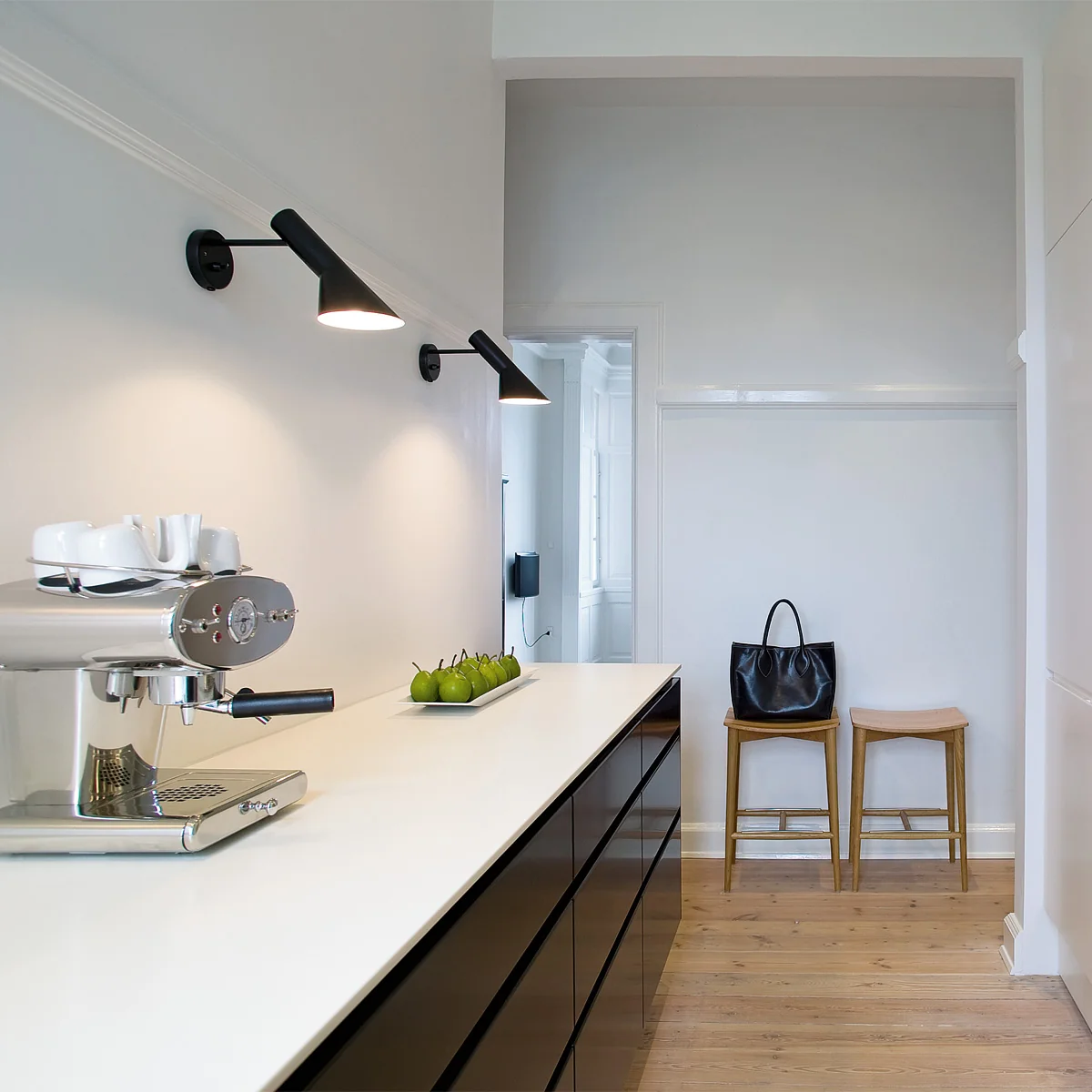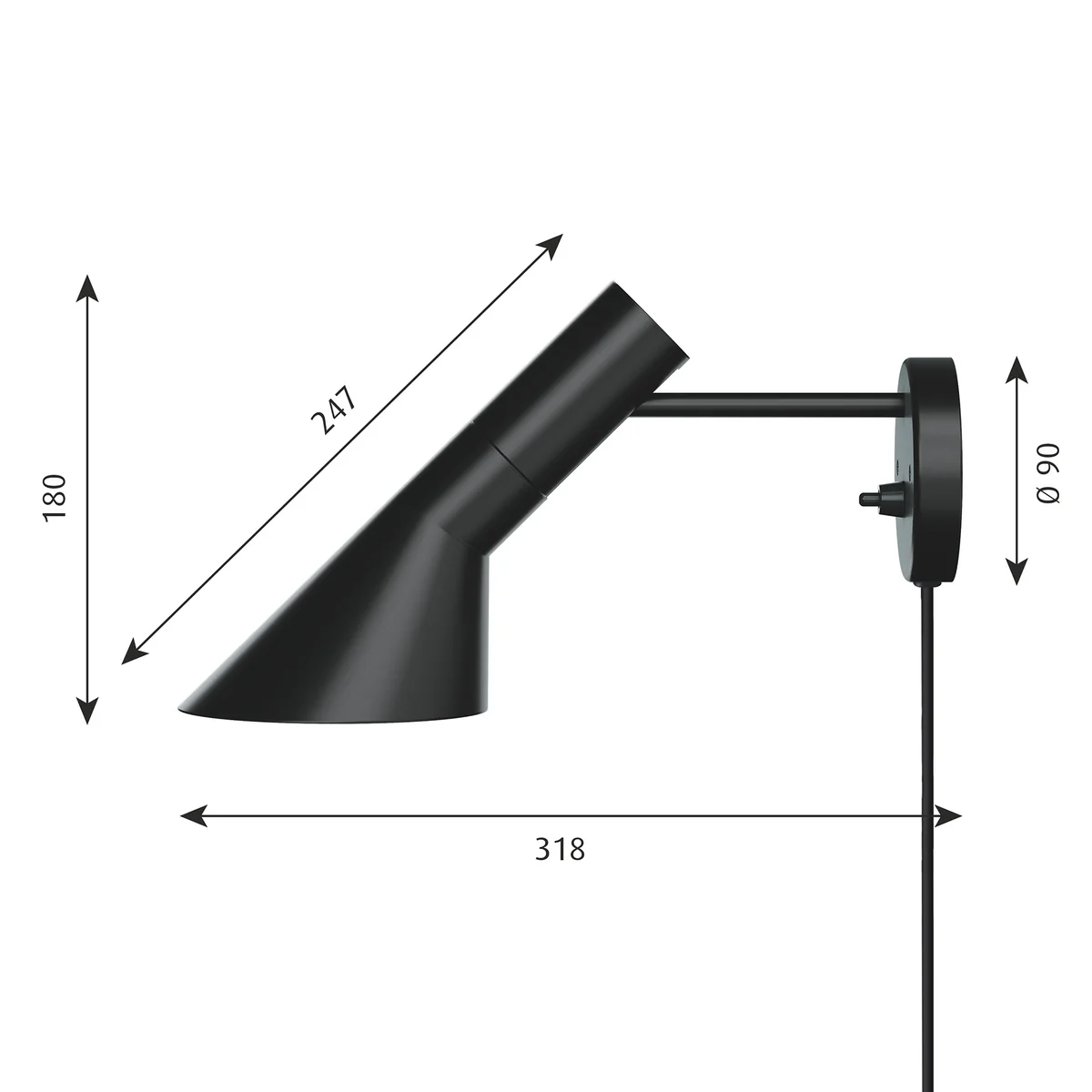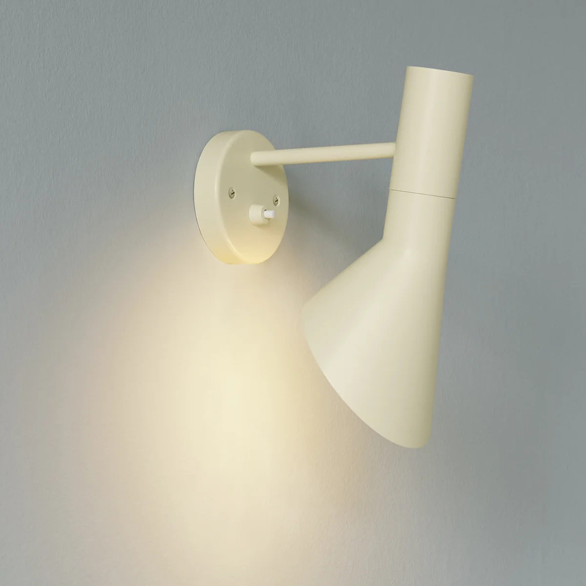 Die AJ Wandleuchte basiert auf den gleichen Prinzipien wie die AJ Stehleuchte. Zur besseren Nutzung als Arbeitsleuchte wurde der Schirm jedoch vergrößert. Die Standardleuchte besteht aus einem Lampenhalter in einer emaillierten Messingröhre. Ein Kippmechanismus ist in der Röhre integriert.