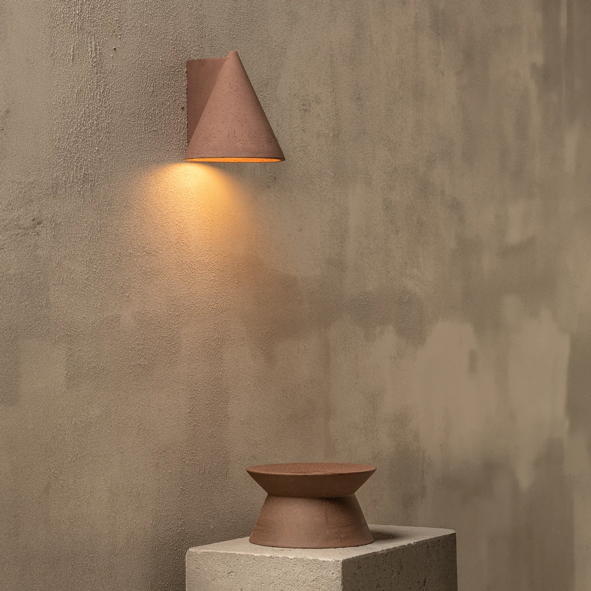 - Aus Beton in Grau oder Dunkelrot gefertigt für eine rohe, minimalistische Ästhetik