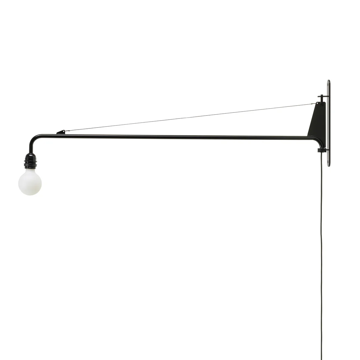 Die auf das Wesentliche – ein Gestell und eine Glühbirne – reduzierte Konstruktion besteht aus pulverbeschichtetem Stahlrohr und Buchenholz. Die Leuchte ist über einen Schnurdimmer regulierbar und wird mit einem Leuchtmittel geliefert.