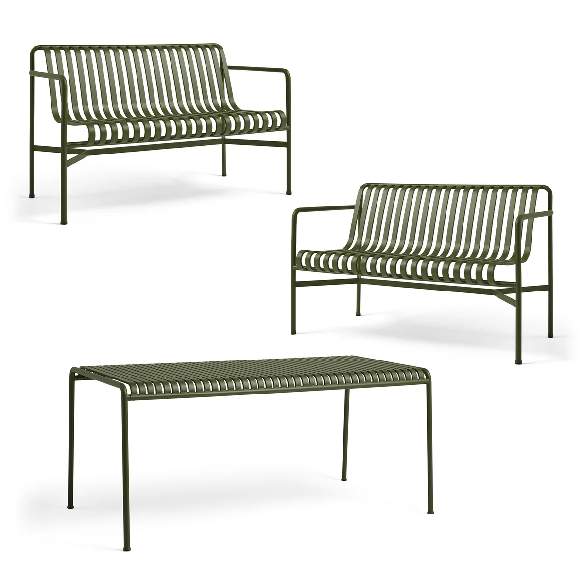 Die Palissade Dining Bank von HAY ist eine Gartenbank, die sich hervorragend für gemütliche Grillabende im Garten eignet. Mit der Rücken- und den Armlehnen bietet die Bank einen hohen Komfort. Dabei erlaubt die ergonomische Form der Bank - auch ohne Polsterung - ein bequemes Zurücklehnen.