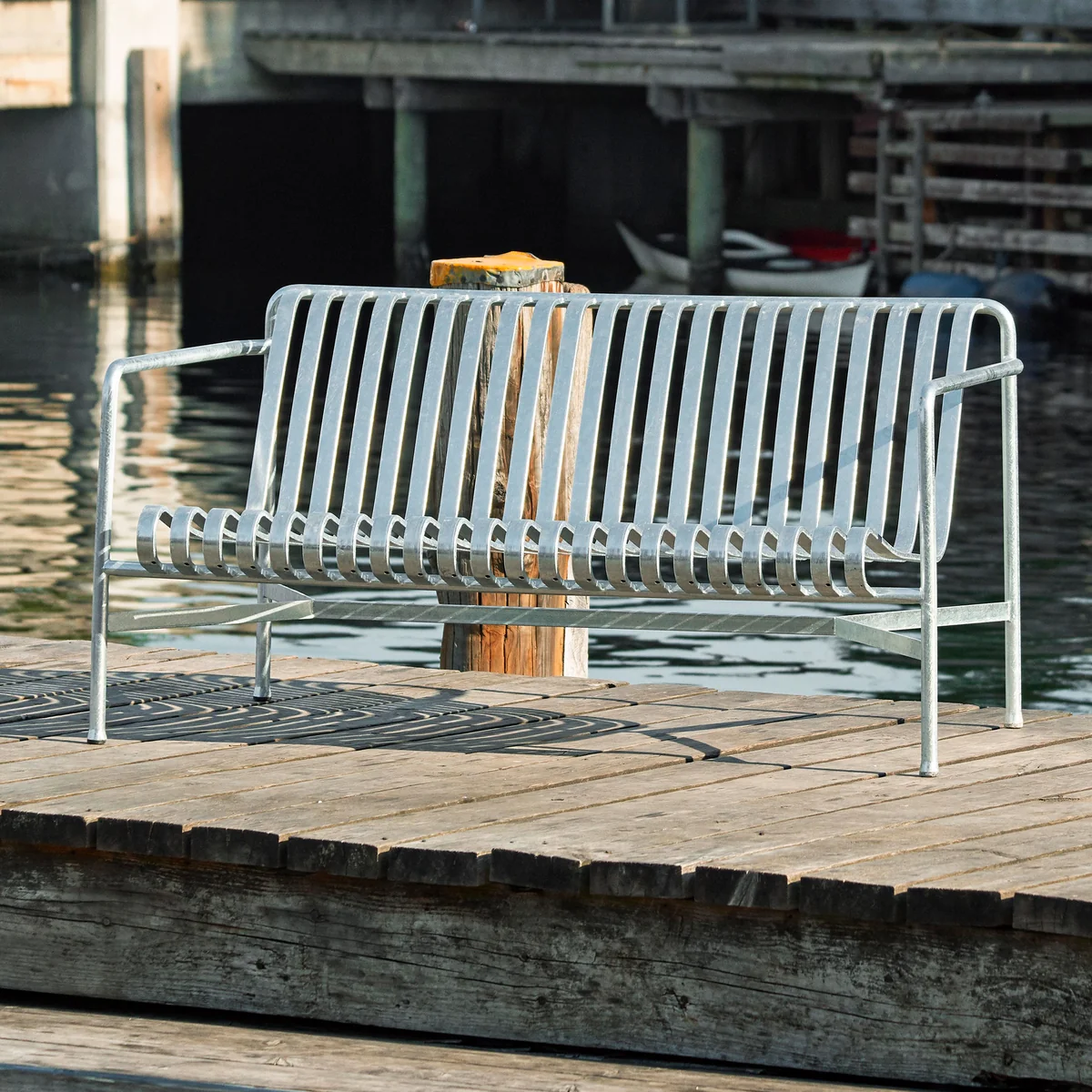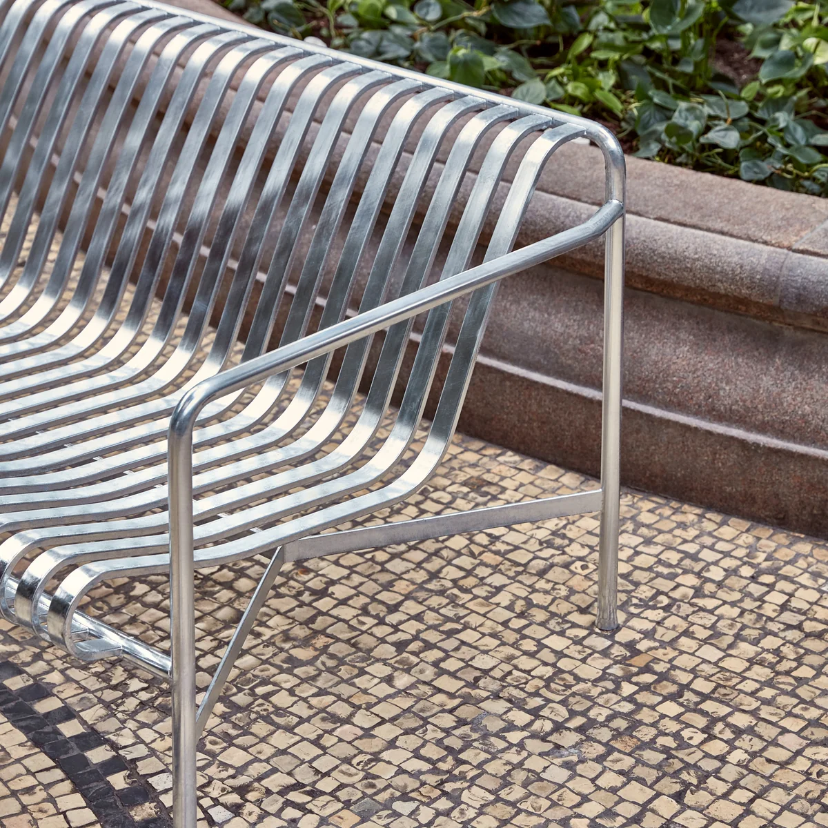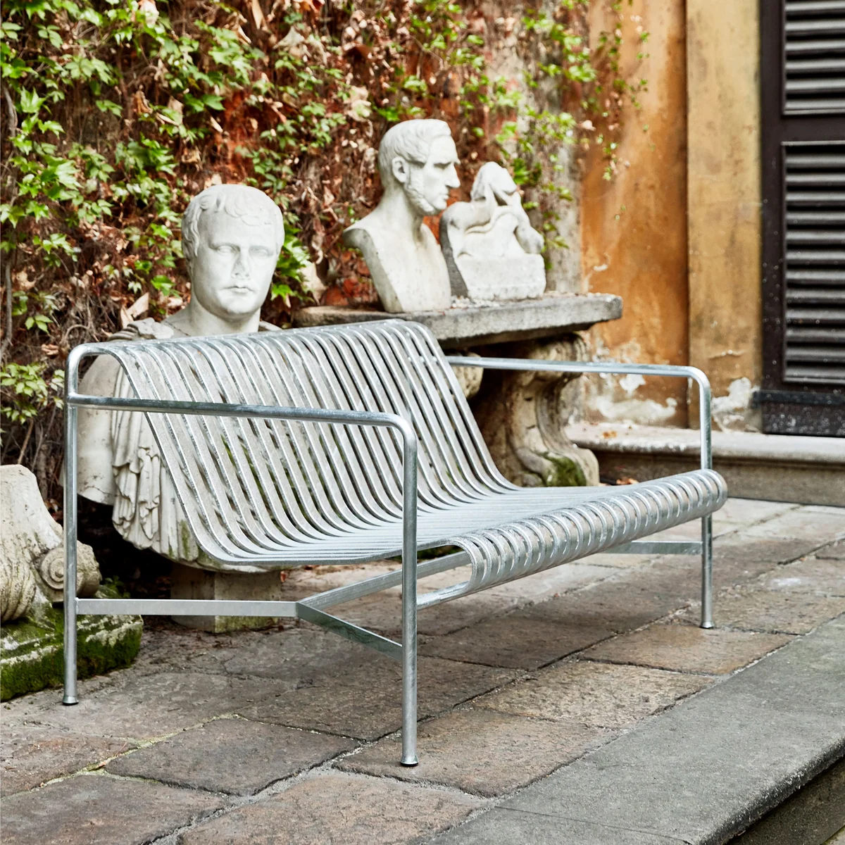 Die Brüder Ronan und Erwan Bouroullec haben mit der Palissade Kollektion eine Reihe von Gartenmöbeln geschaffen, die sich ideal für den Außenbereich eignet. Wie alle anderen Möbel aus der Serie besteht auch das Sofa aus einer rillenförmigen Oberfläche aus pulverbeschichteten Stahllatten. Der Vorteil besteht darin, dass anfallendes Regenwasser problemlos durch die Rillen ablaufen kann und sich nicht zu einer Pfütze sammelt.