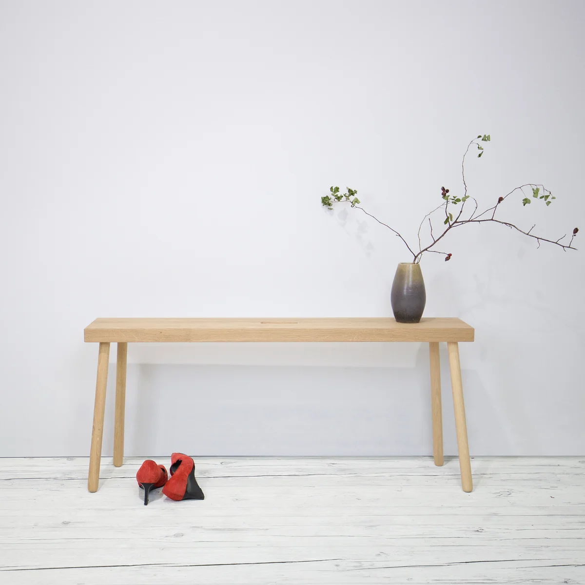 Die Baenkk ist eine klassische Holzbank von kommod, die sich aufgrund ihres minimalistischen Designs hervorragend in jedes Ambiente einfügt. Besonders in kleinen Räumen bietet die schlanke Bank eine praktische Sitzgelegenheit und kann zugleich dekorativ in Szene gesetzt werden.