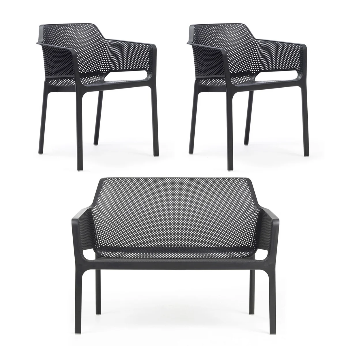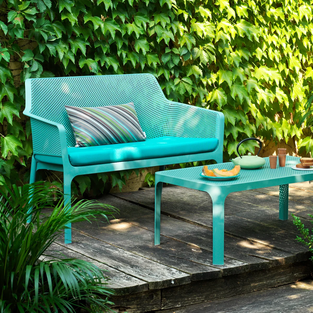 Auf der Net Bank von Nardi lassen sich entspannte Sonnenstunden im Garten verbringen. Mit einer Länge von 116 cm bietet die Bank entspannt Platz für zwei Personen und sorgt dank der Armlehnen für maximalen Komfort. Gefertigt ist die Bank aus durchgefärbtem, recycelbarem Fiberglas-Polypropylen, das strapazierfähig ist und sich bestens für die Nutzung im Außenbereich eignet. Das Material ist UV-beständig und mit einer rautenförmigen Perforation versehen, wodurch Regenwasser ganz einfach abfließen kann. Gleichzeitig findet eine Belüftung des Rückens statt, was besonders an heißen Tagen von Vorteil ist.