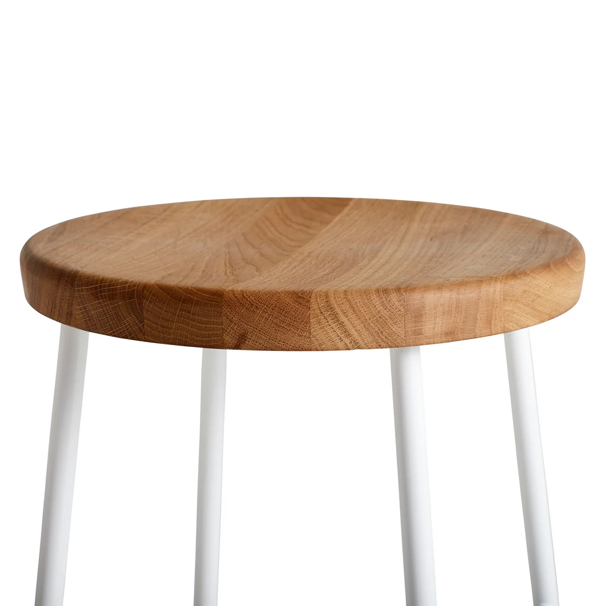 Jonas Trampdachs Cornet Barhocker von HAY ist ein klassischer Barhocker mit einer innovativen Stahlrohrtechnik, die von Fahrradträgern inspiriert wurde. Der runde Sitz aus massivem Eichenholz ruht auf einer schlanken Stahlbasis und kreiert eine interessante Komposition aus den verschiedenen Materialien, die den Hocker modern und zeitlos wirken lassen.