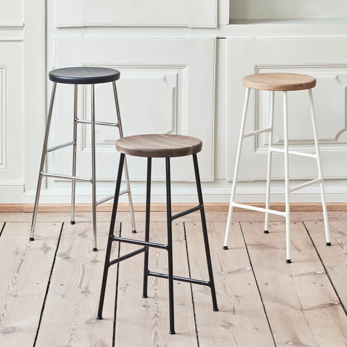 Der Hocker ist in zwei verschiedenen Höhen erhältlich, mit einer Auswahl an Holzoberflächen für den Sitz und verchromten oder pulverbeschichteten Farboptionen für die Beine. Die Stühle eignen sich für Bars, Kochinseln und Arbeitsplatten an verschiedenen privaten und öffentlichen Orten.