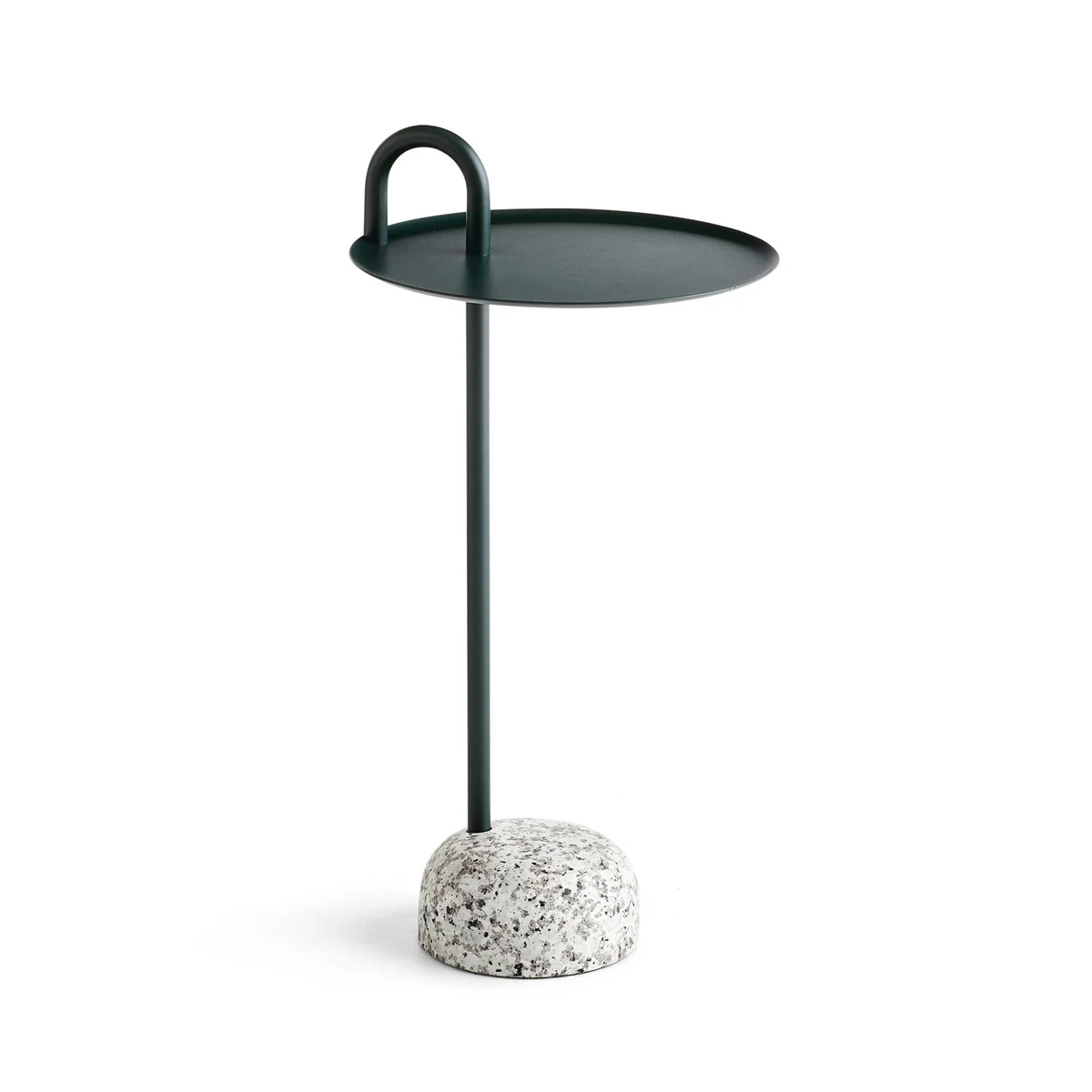 Der Bowler Beistelltisch von HAY ist ein Entwurf des Designers Shane Schneck und besticht durch seine besondere Form und die harmonische Kombination der Materialien. Gefertigt ist der Beistelltisch aus einem Stahlrohr, das sich durch die runde Tischplatte erstreckt und nach oben hin zu einem praktischen Griff biegt. Seine Basis ist aus Granit gefertigt, sorgt für eine raue Note und bietet zugleich Stabilität. Dennoch ist der Tisch leicht genug, um ihn einfach transportieren zu können. So kann der Bowler Beistelltisch neben dem Sofa ebenso platziert werden wie als Nachttisch neben dem Bett.