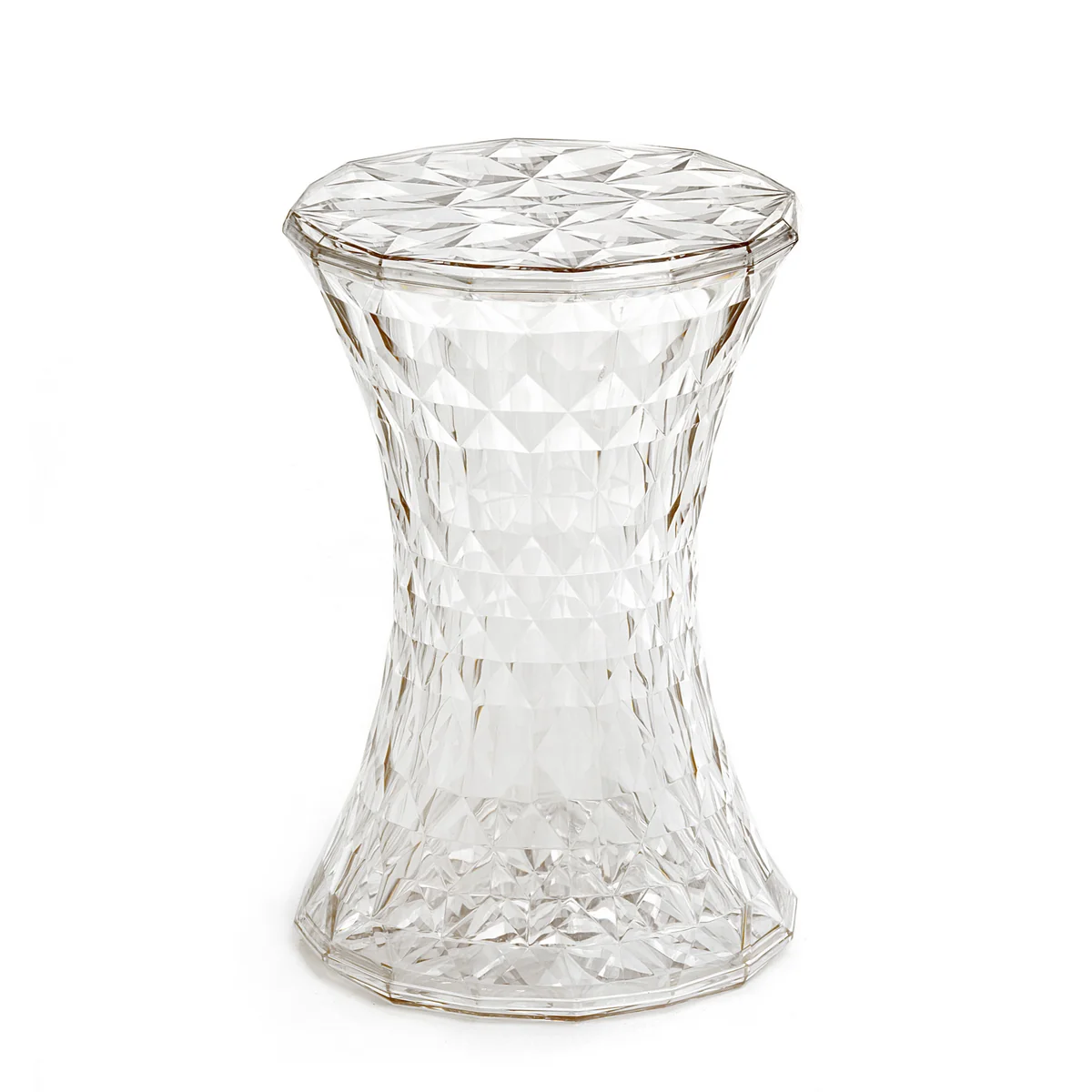 Ein niedriger Hocker, der aus einem einzigen Guss hergestellt ist und sich durch eine sachlich lineare und symmetrische Form auszeichnet, die an eine Sanduhr erinnert. Eine Sanduhr jedoch mit einer ganz besonderen Oberfläche: von unregelmäßiger Gestalt, bestehend aus vielen geometrischen, spiegelnden Facetten, mit spezieller Lichtwirkung, aus der sich ein ganz besonderes Farbspiel ergibt, das an einen Diamanten erinnert. Eben gerade durch diese preziöse Eigenschaft wird der Hocker Stone von Kartell in unterschiedlichen Farben der Edelsteine angeboten.