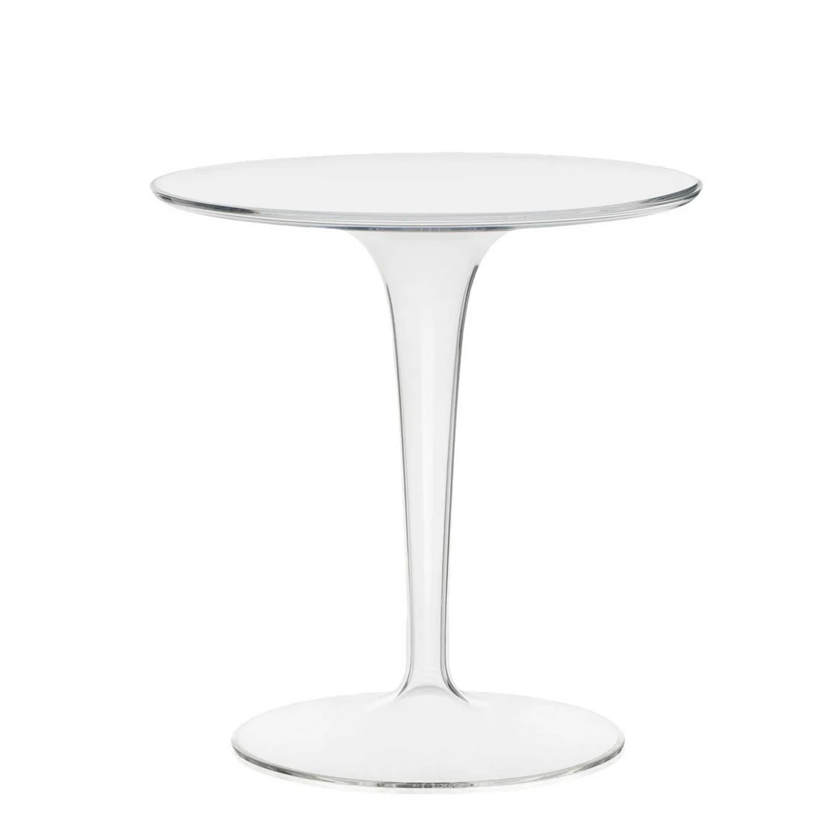 Die Kombination der durchsichtigen Tischplatte mit dem durchsichtigen, hohlen Tischbein des Tip Top Tisches verleiht der Struktur des Designerstücks von Kartell Tiefe.