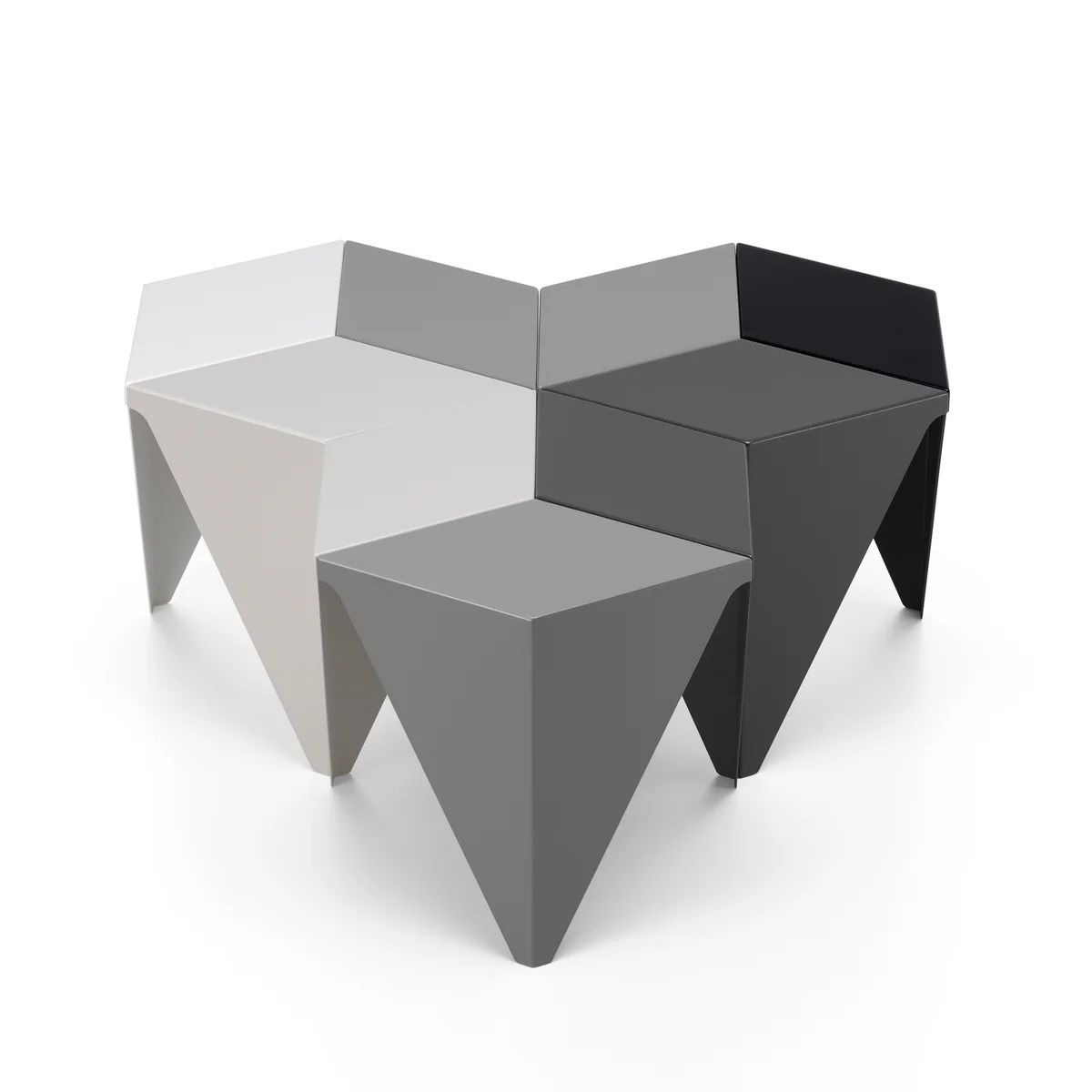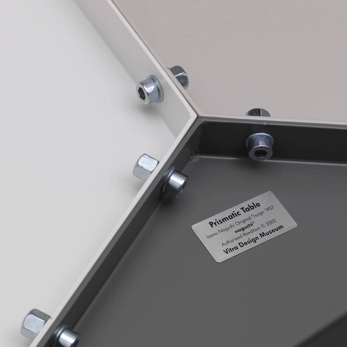 Noguchis Prismatic Table basiert auf einer rein geometrischen Formensprache. Der originelle, dreibeinige Beistelltisch mit seiner sechseckigen Platte besteht aus gefalztem Aluminiumblech und war inspiriert von der traditionellen japanischen Papierfalttechnik.