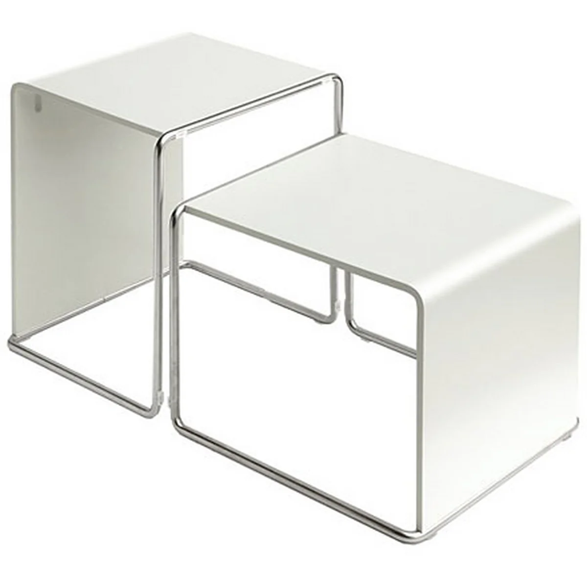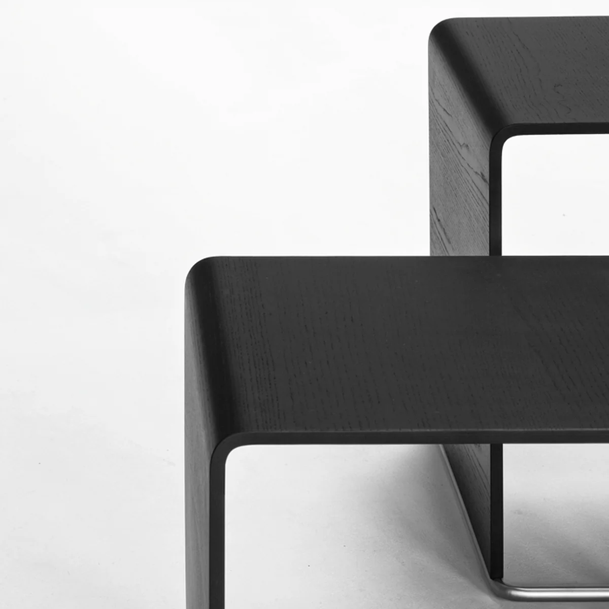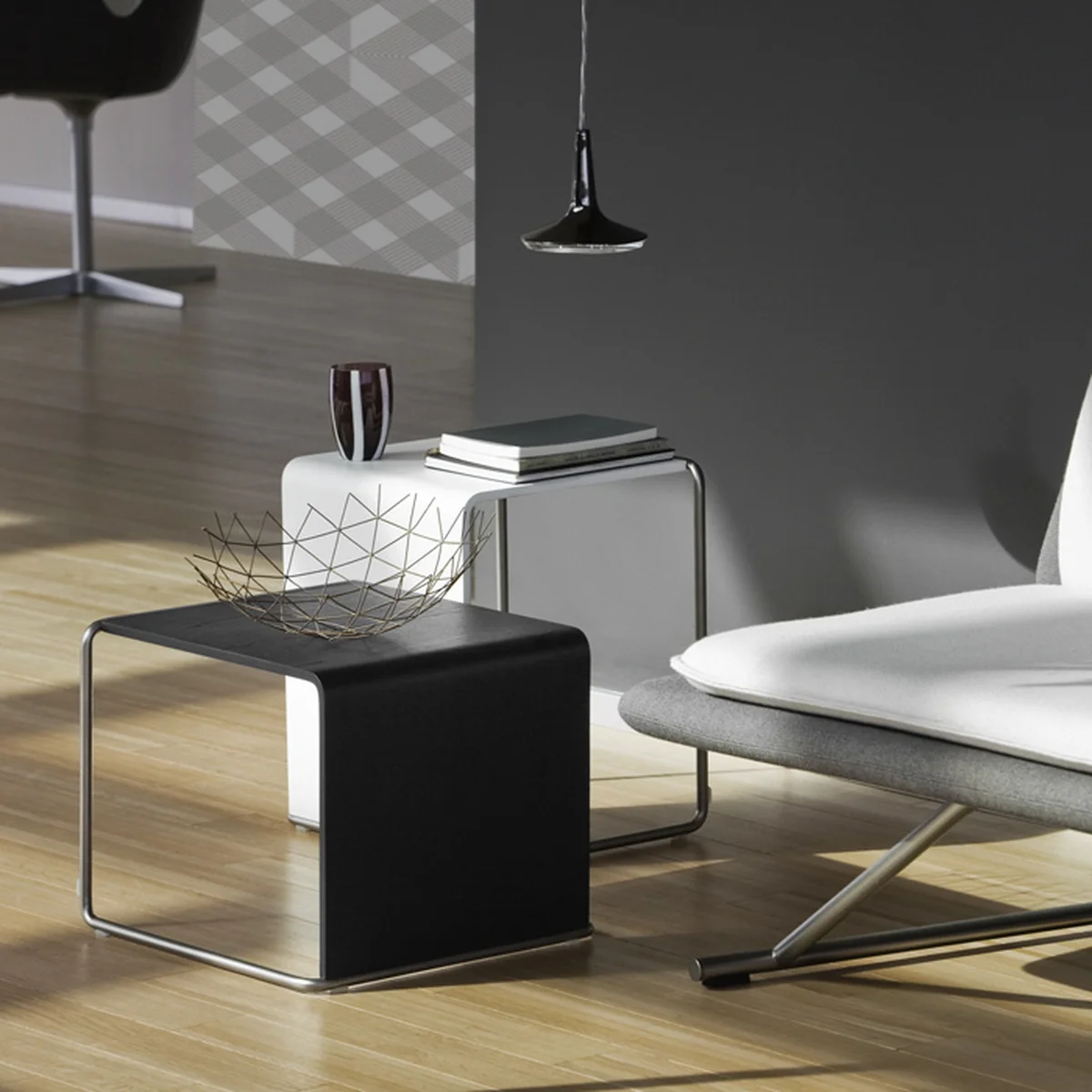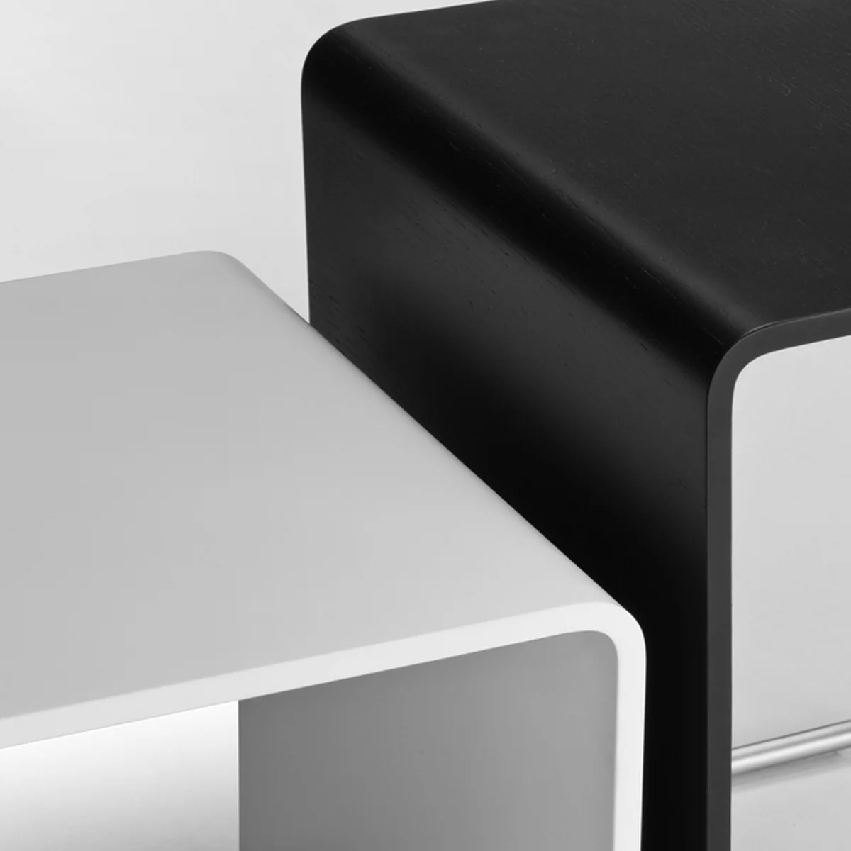 Das Gestell des Beistelltisches und Hockers besteht aus sandgestrahltem Edelstahl; die Tisch- bzw. Sitzplatte ist aus Multiplex in Eiche gebleicht, sowie weiß und schwarz lackiert erhältlich.