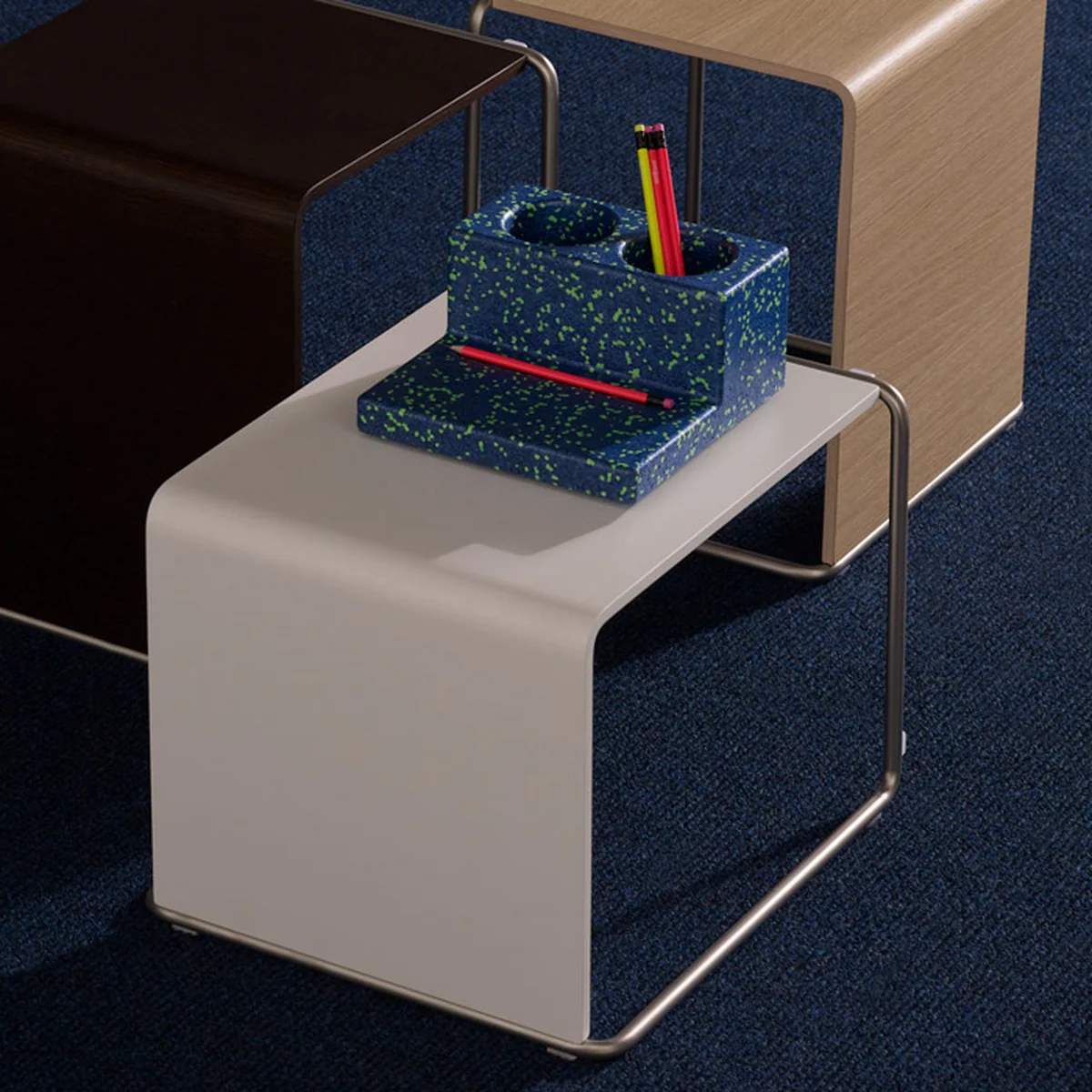 Ueno ist ein stapelbares und variables Objekt, das sowohl flach als auch hochkant gestellt werden kann.