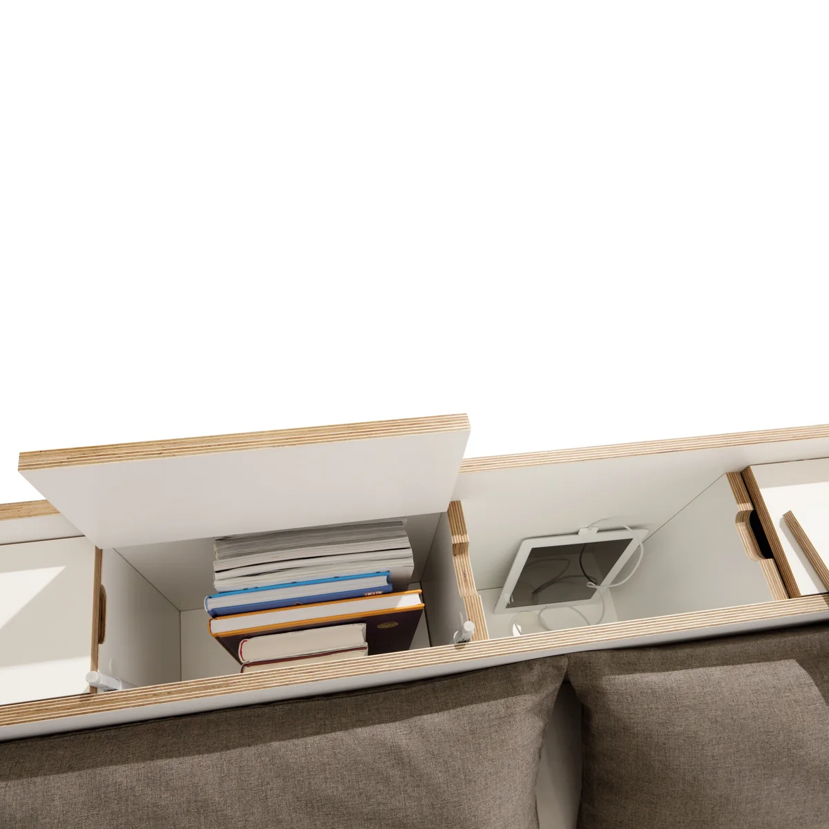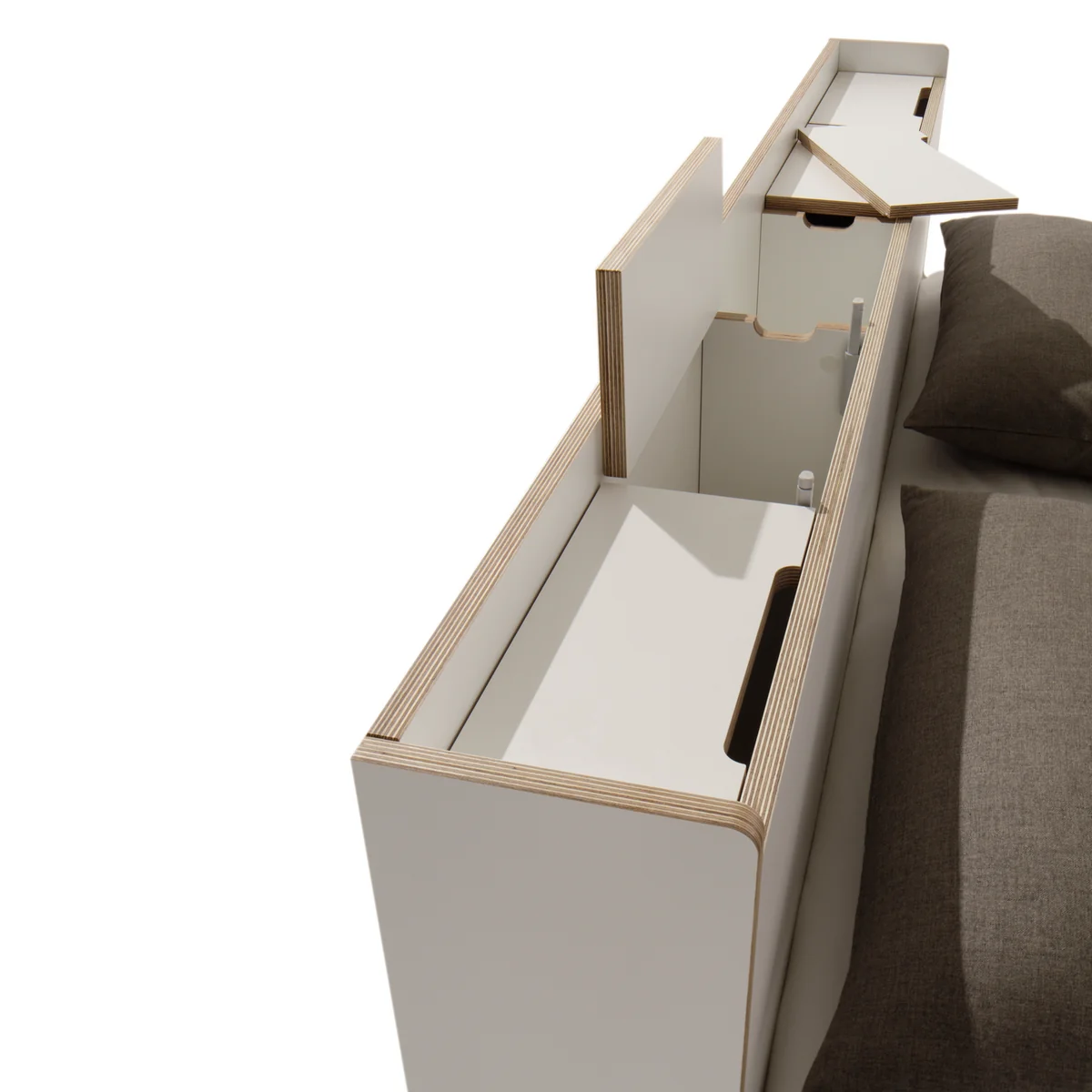 Das Kopfteil ist ein reines Raumwunder: Die obere großzügige Ablagefläche bietet viel Platz für Bücher, Wecker, Nachttischlampen & Co. Alle Geräte können bequem und unauffällig durch die schlanken Öffnungen in den Abdeckplatten des Müller Small Living Nook Doppelbetts mit Strom versorgt werden. Unter den Abdeckplatten, die teilweise vollständig abnehmbar, teilweise mit Klappscharnieren ausgestattet sind, wird viel zusätzlicher Stauraum zugänglich.