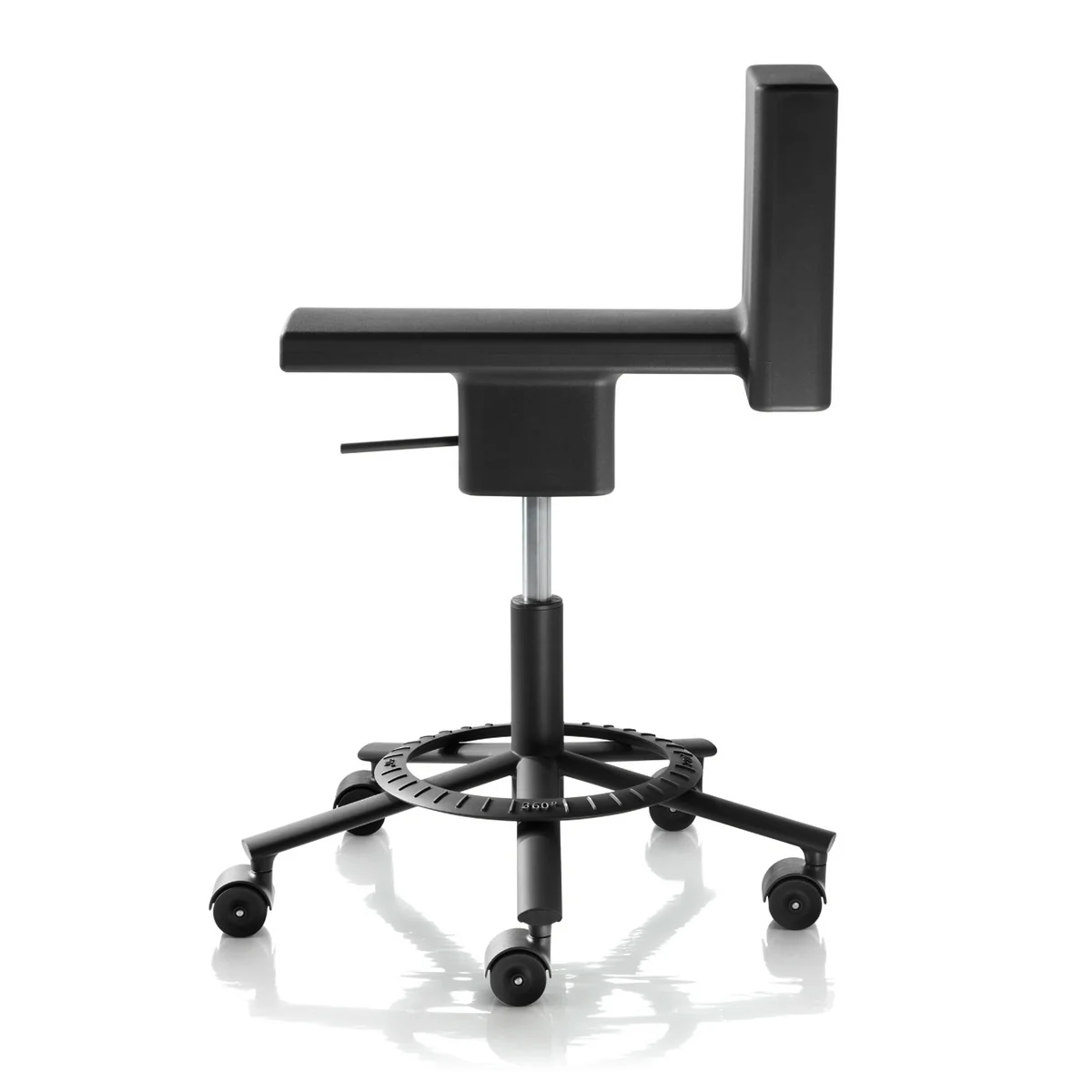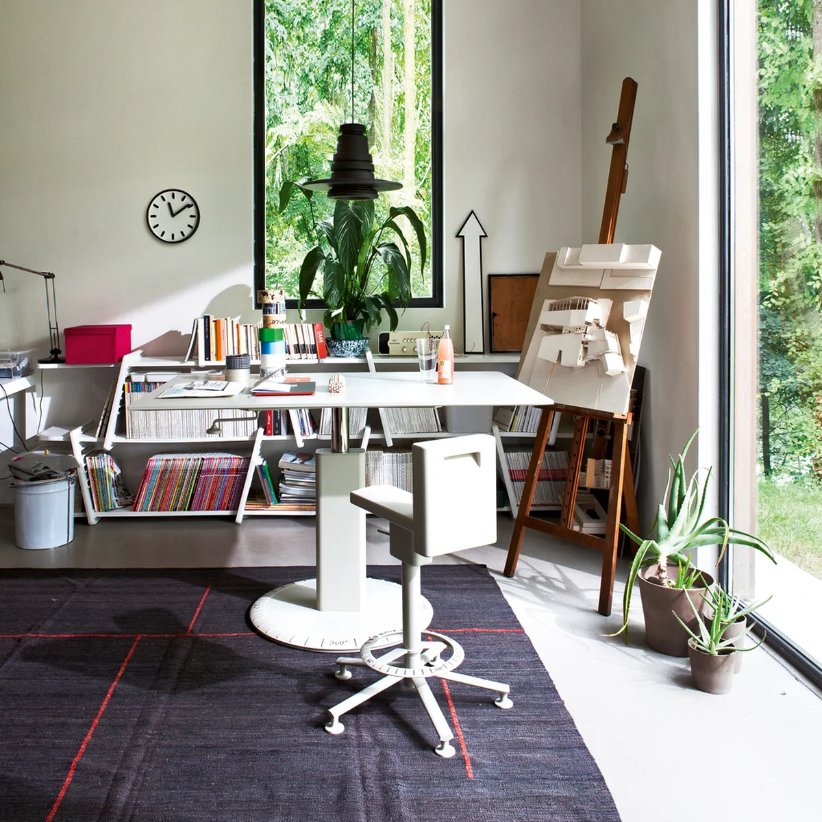 Der 360° Bürostuhl von Magis wurde von Konstantin Grcic entworfen und gehört zu einer Serie an Möbeln für das Arbeitszimmer oder das Büro. Der Stuhl besteht aus einem drehbaren Fünfstern-Gestell mit Rollen aus epoxylackiertem Stahl. Die praktische Fußstütze wird aus Aluminium-Druckguss hergestellt und der selbsttragende Sitz besteht aus Polyurethan-Integralschaum. Der Sitz ist es auch, der den Stuhl zum Hingucker im Raum werden lässt.
