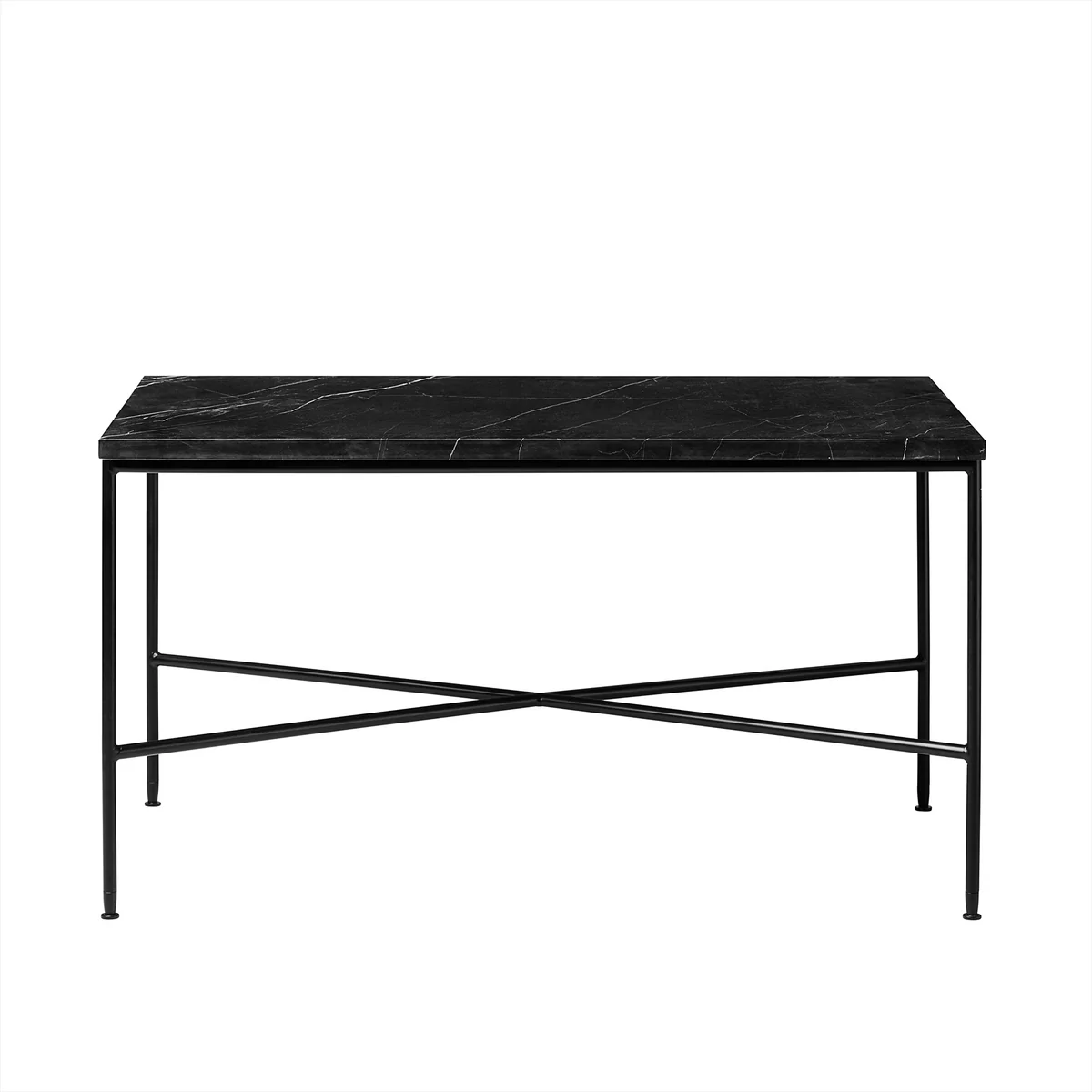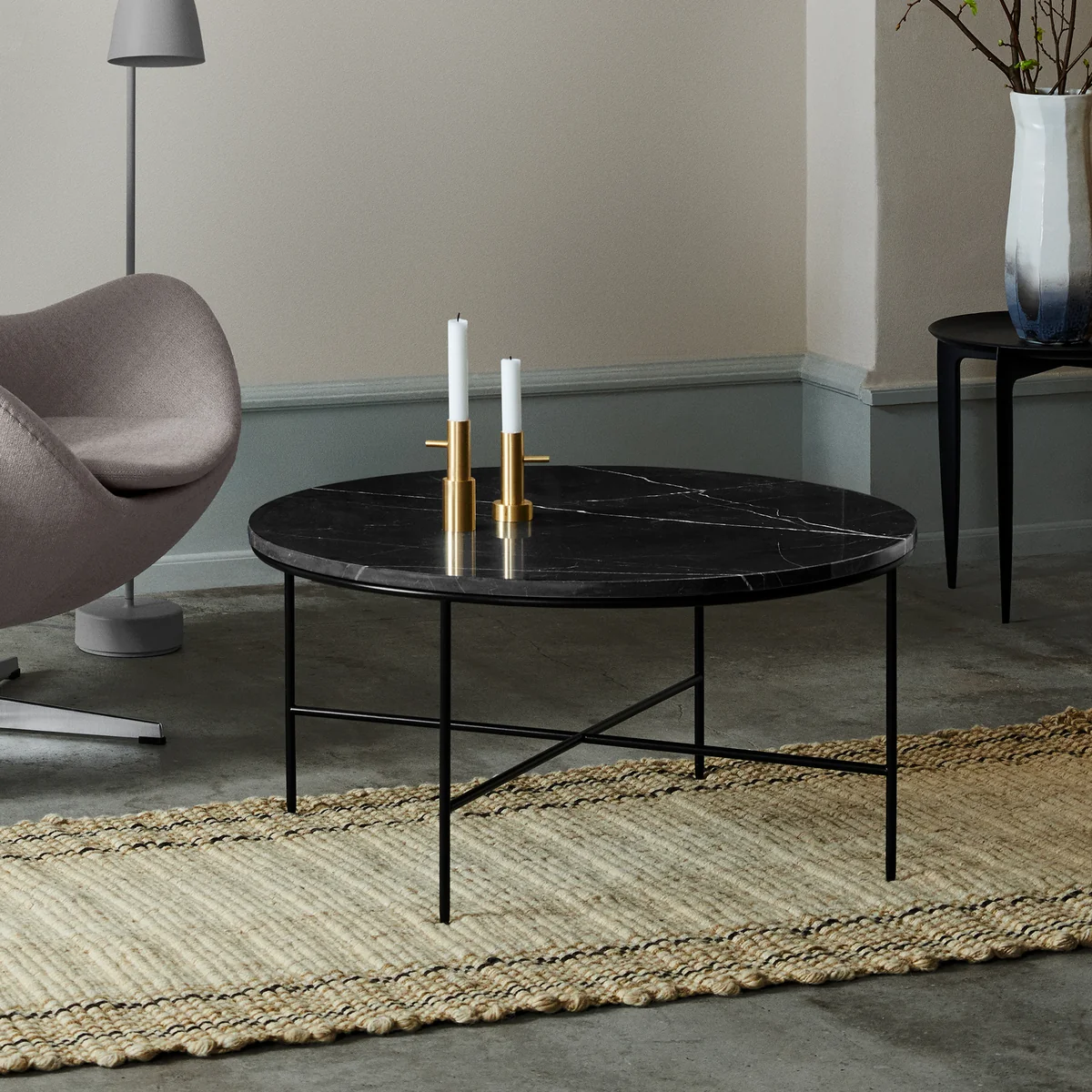 Damit der Tisch nicht wuchtig oder überladen wirkt, thront die Platte auf einem filigranen Gestell aus pulverbeschichtetem Stahl, das im unteren Bereich elegant überkreuzt ist und damit für Leichtigkeit im Gesamterscheinungsbild sorgt.
