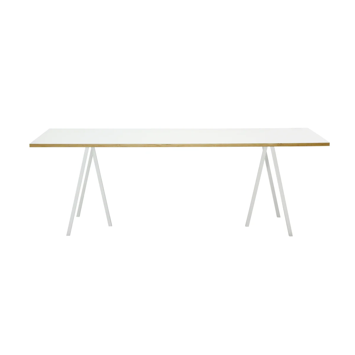 Auch der Loop Stand Tisch kommt überaus schnörkellos daher. Seine glatte Oberfläche schließt mit klaren Kanten ab. Bei der schwarzen Variante sind Platte (Linoleum) und Kanten (Eschenholz) einfarbig lackiert, wodurch der Tisch mit den sechs Beinen edel und schick wirkt. In weiß sind die Ränder der Tischplatte (Laminat) naturholzfarbig (Sperrholz) belassen, was Loop einer klassisch skandinavischen Ferienhaus-Optik gibt. Die Beine sind aus lackiertem, pulverbeschichtetem Stahl gefertigt.