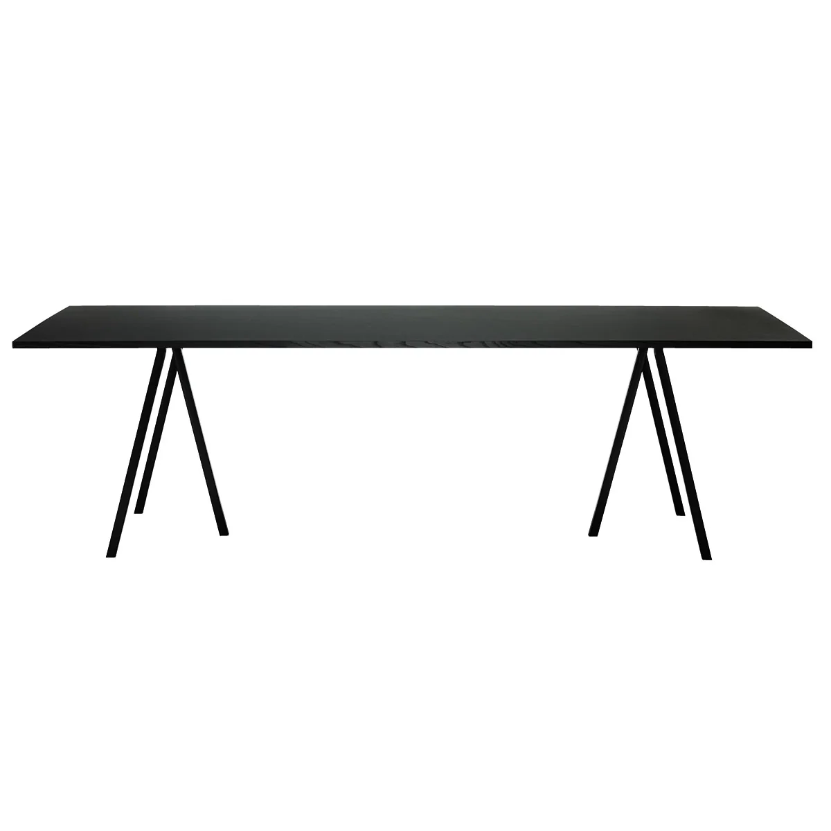 Auch der Loop Stand Tisch kommt überaus schnörkellos daher. Seine glatte Oberfläche schließt mit klaren Kanten ab. Bei der schwarzen Variante sind Platte (Linoleum) und Kanten (Eschenholz) einfarbig lackiert, wodurch der Tisch mit den sechs Beinen edel und schick wirkt. In weiß sind die Ränder der Tischplatte (Laminat) naturholzfarbig (Sperrholz) belassen, was Loop einer klassisch skandinavischen Ferienhaus-Optik gibt. Die Beine sind aus lackiertem, pulverbeschichtetem Stahl gefertigt.