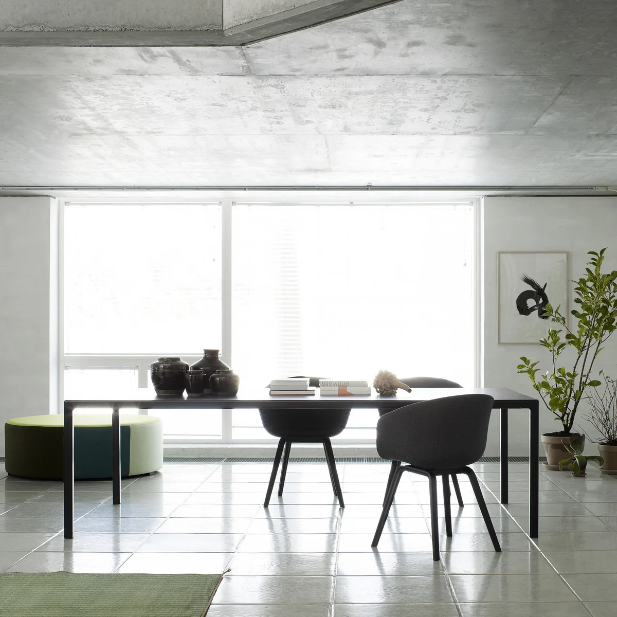 Das Gestell des T12 Tisches besteht aus pulverbeschichtetem Aluminiumguss und ist in Schwarz und Weiß erhältlich. Der T12 Tisch von HAY ist in verschiedener Größen erhältlich, unter anderem mit einer bis zu 2.50 Meter langen Tischplatte.