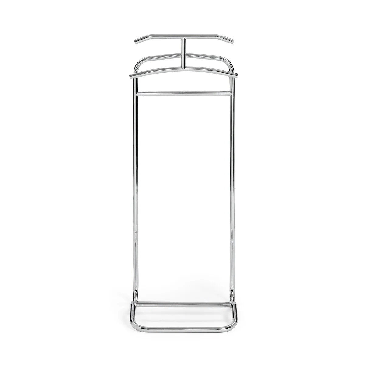 Der Herrendiener von ClassiCon besteht aus verchromtem Stahlrohr. Aufgrund seines Materials und seines zeitlosen Designs fügt sich der Kleiderständer optimal in verschiedenste Wohnlandschaften ein. Der 1932 von Muthesius entworfene Diener bietet Platz für ein Jackett, einen komplettem Anzug und Hemd, ohne dass die Bügelform dabei verloren geht.