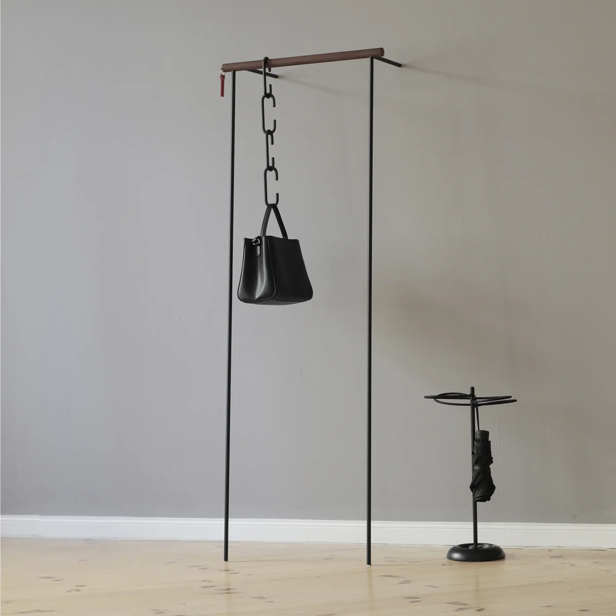 Die Leanon Garderobe von Roomsafari ist eine Garderobe für Freunde des praktischen und minimalistischen Designs. Leanon ist, wie der Name schon andeutet, eine Anlehngarderobe. Das Besondere daran ist, dass für die Befestigung von Leanon nicht gebohrt, gedübelt oder geschraubt werden muss, sondern die Garderobe einfach an die gewünschte Wand angelehnt wird.