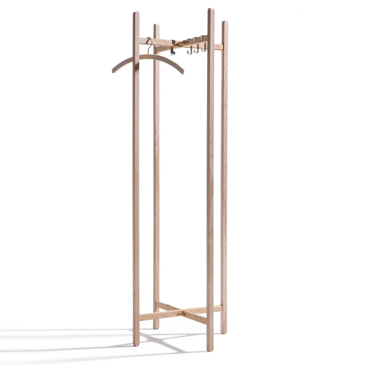 Wenn nur wenige Jacken aufzuhängen sind oder die Garderobe transportiert werden soll, ist die New Hang On im Handumdrehen flach gemacht. Wenn sich Gäste ankündigen oder auch mal mehrere Kleidungsstücke an dem praktischen Möbelstück Platz finden sollen, wird sie ebenso schnell wieder zur großen Stehgarderobe mit viel Stauraum.