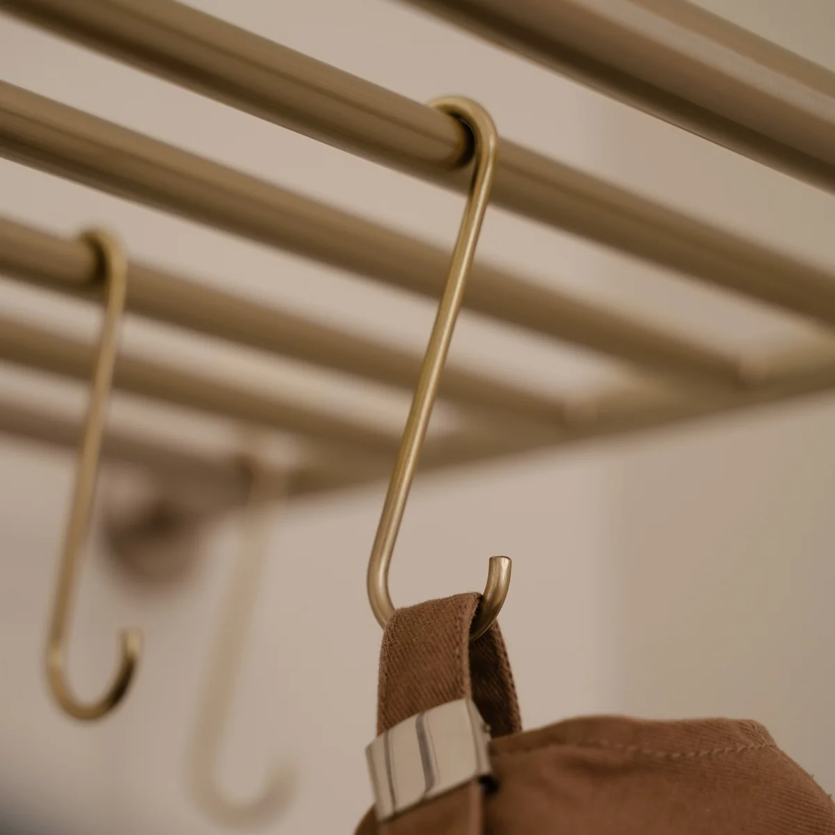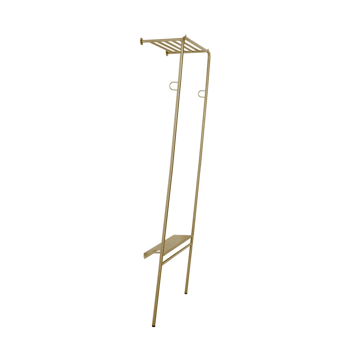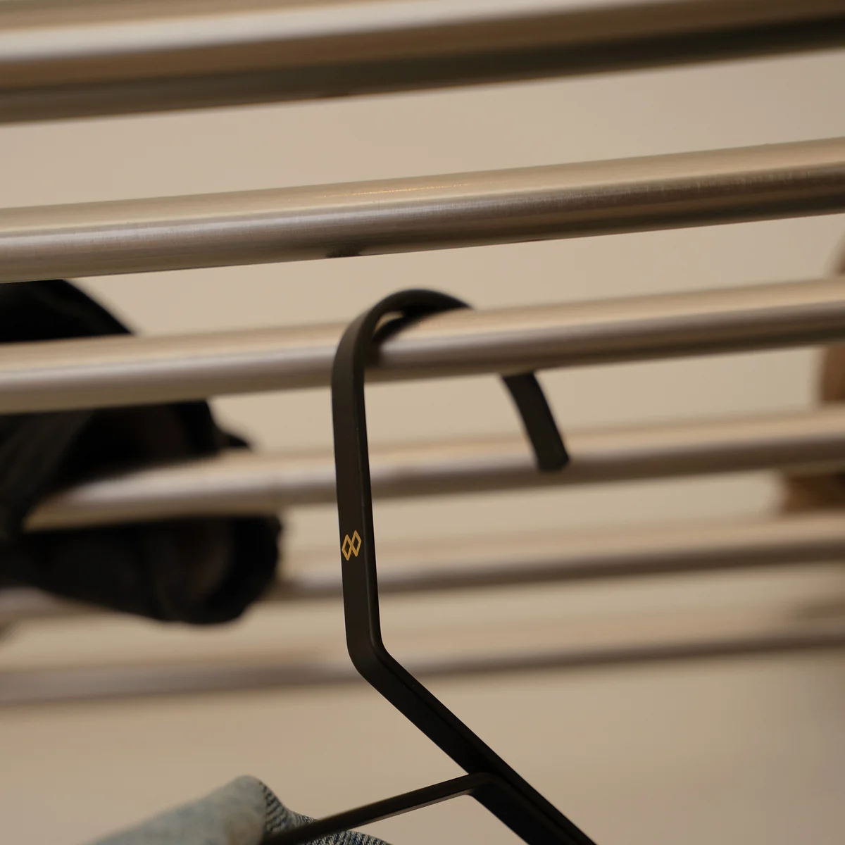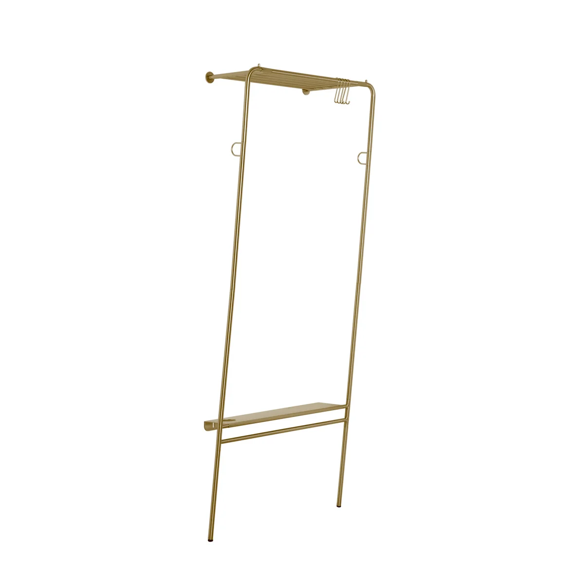Pulverbeschichteter Stahl verleiht dem von Jonas Søndergaard entworfenen Kleiderständer einen leichten Industriestil, unterbrochen von warmen Messing-Details.