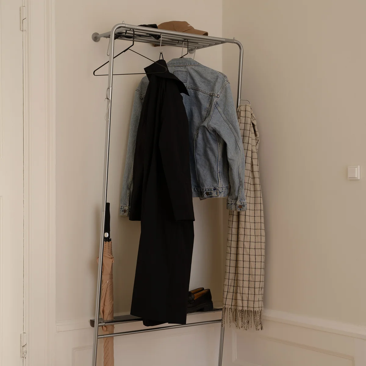 Es gibt eine kleine Ablage für Handtaschen sowie eine praktische Öffnung für Regenschirme. Der Rahmen des Kleiderständers hat zusätzliche Schlaufen, um beispielsweise die Hundeleine daran aufzuhängen.