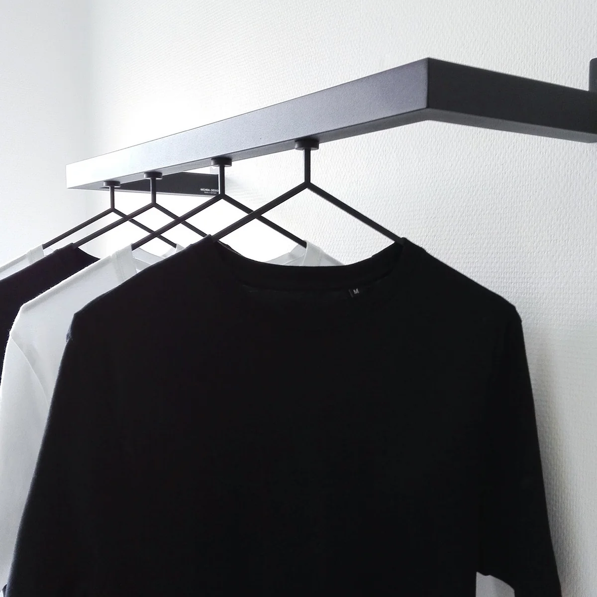 HangSys von Nichba Design ist eine moderne und minimalistische Wandgarderobe, die mit ihrem zeitlosen Aussehen überzeugt. Die Garderobe besteht aus einer Konstruktion aus pulverbeschichtetem Stahl, die für magnetische Kleiderbügel gemacht ist.