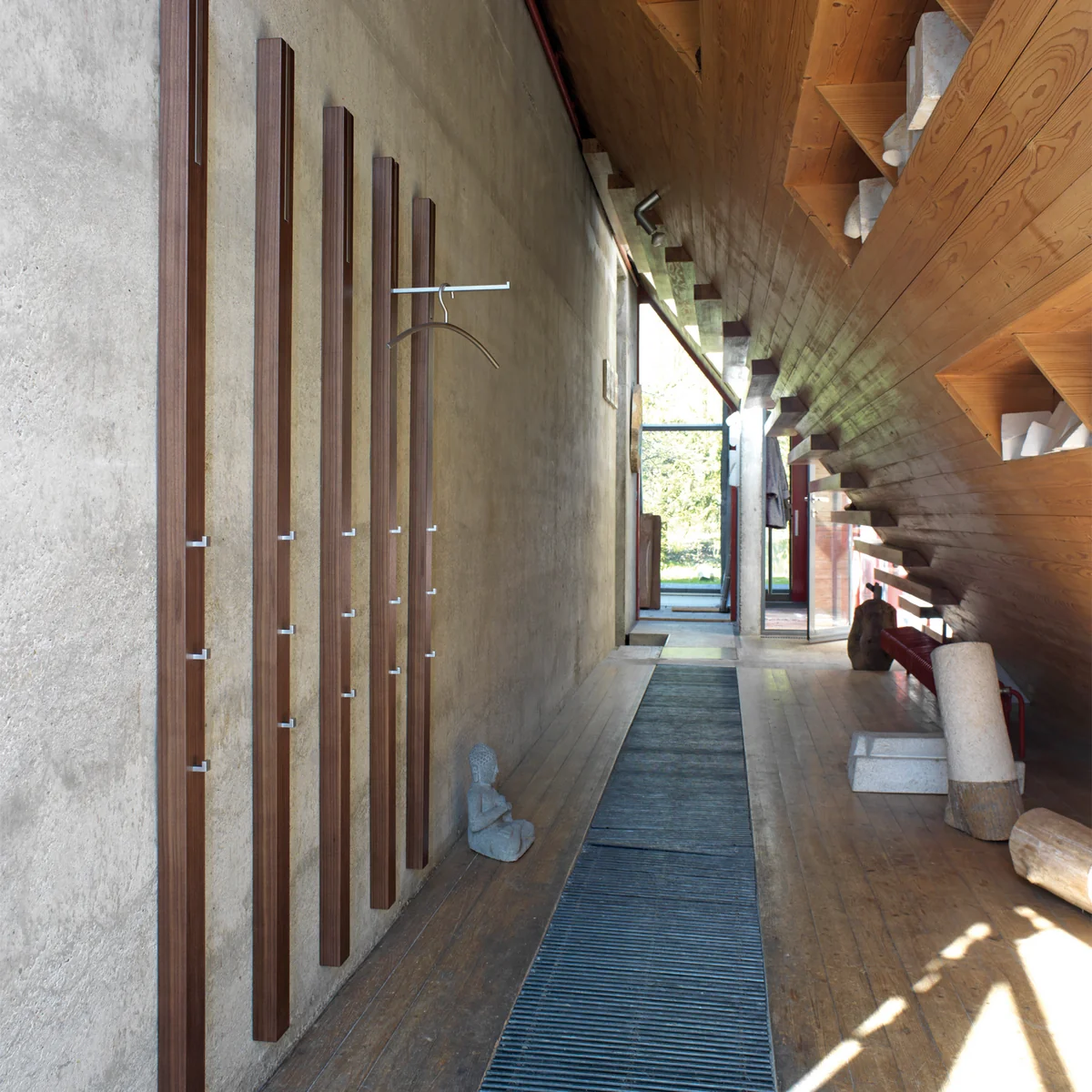 Am Kopfende besitzt Line einen Klapphaken, der bis zu 26,5 Zentimeter von der Garderobenleiste absteht. Hierbei ist Line aber flexibel: der Neigungswinkel kann von der Rückseite mit einer Verstellschraube eingestellt werden. So kann die Garderobe direkt Jacken aufnehmen, aber auch (wenn der Klapphaken rechtwinkelig zur Garderobenleiste steht) mit Kleiderhaken behängt werden und so indirekt noch mehr Kapazitäten aufnehmen. Ob solo oder in der Gruppe nebeneinander – Line verstaut ihre Kleidung stilvoll und sicher.