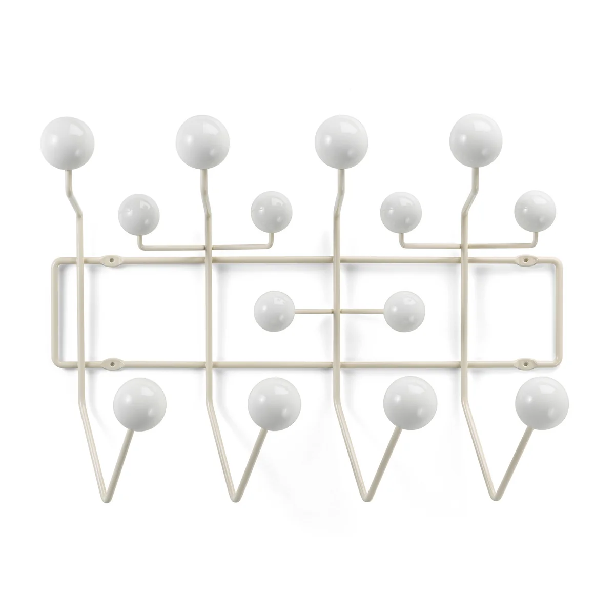 Bei dem eigentlich als Kindergarderobe entworfenen Designklassiker von Vitra sollen die farbigen Holzkugeln Kinder dazu ermuntern, wie der Name »Hang it all« es ausdrückt, all ihre Sachen daran aufzuhängen: Jacken, Spielzeug, Rollschuhe, Puppen oder Rucksäcke.