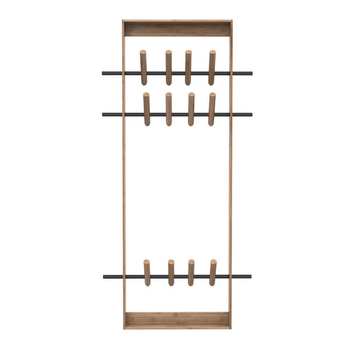 An dem Bambusrahmen sind drei verstellbare Kleiderstangen aus Metall mit jeweils vier verstellbaren Garderobenhaken aus Bambus befestigt. Dieses System ermöglicht eine optimale Flexibilität und erzeugt auch dann eine einzigartige Wirkung, wenn es nicht komplett befüllt ist.