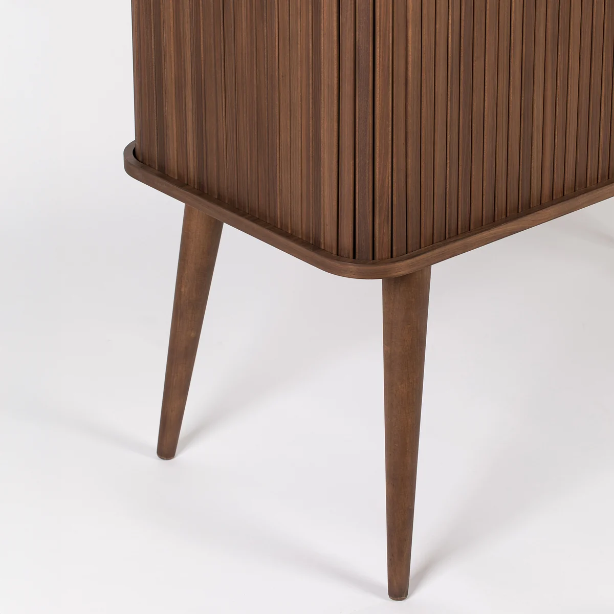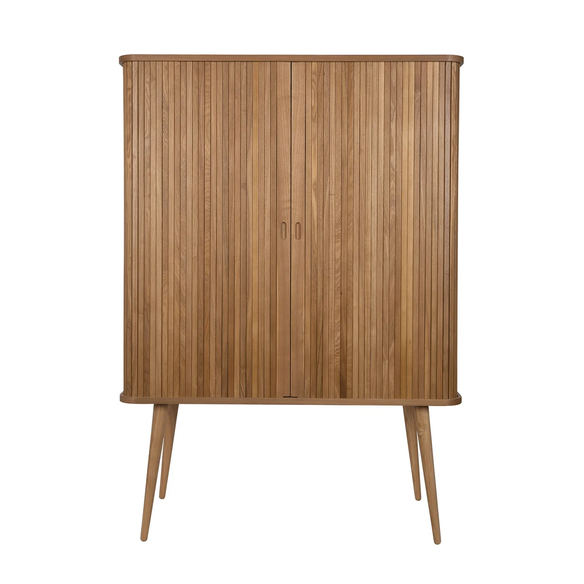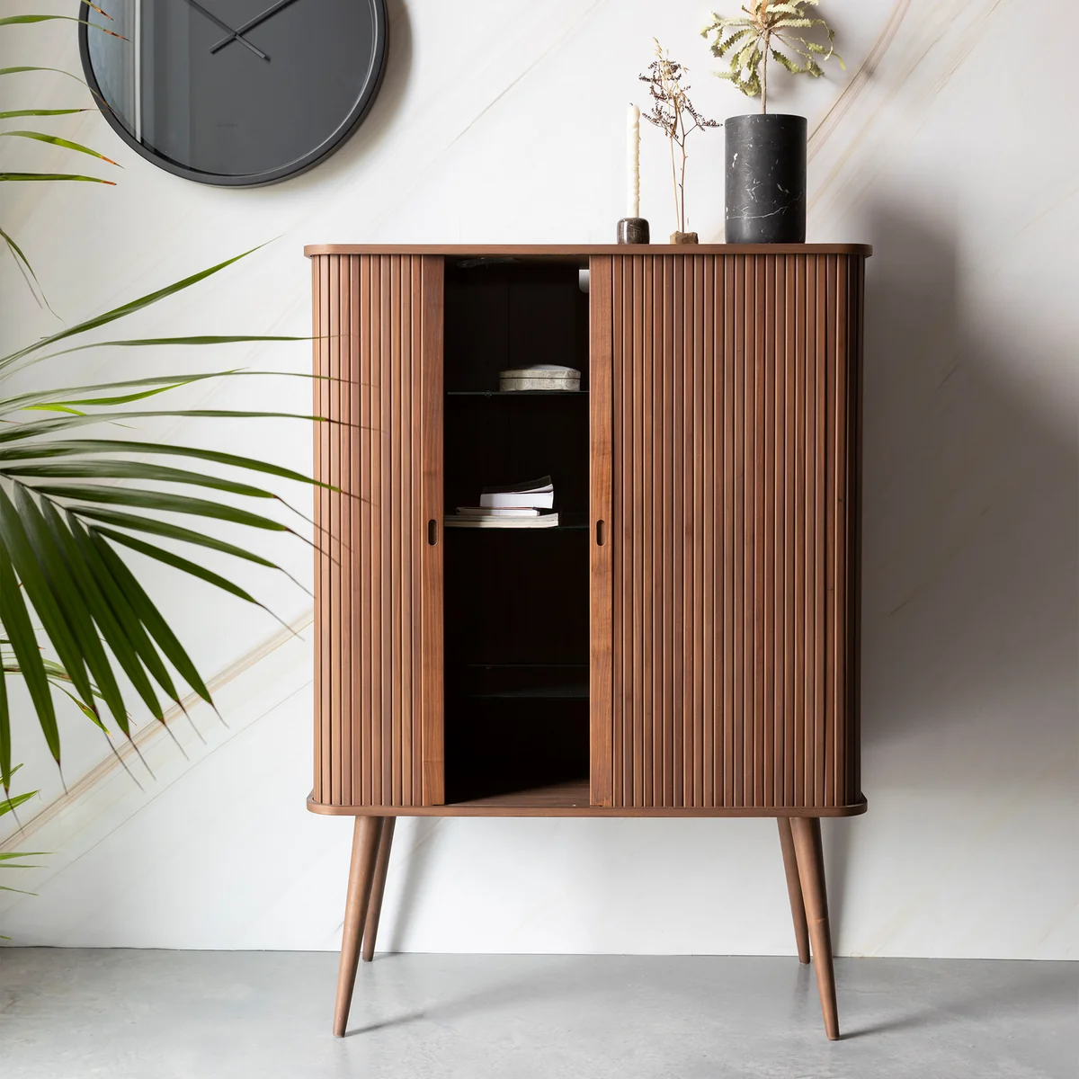 Das Barbier Highboard von Zuiver verbindet elegantes Retro-Design mit funktionalem Stauraum. Die markanten gerillten Holz-Schiebetüren lassen sich ganz nach Wunsch öffnen oder schließen – und erinnern mit ihrer Bewegung an klassische Theaterkulissen. Ob komplett verschlossen, halb geöffnet oder ganz offen: Der Inhalt rückt genau dann in den Mittelpunkt, wenn es gewünscht ist.