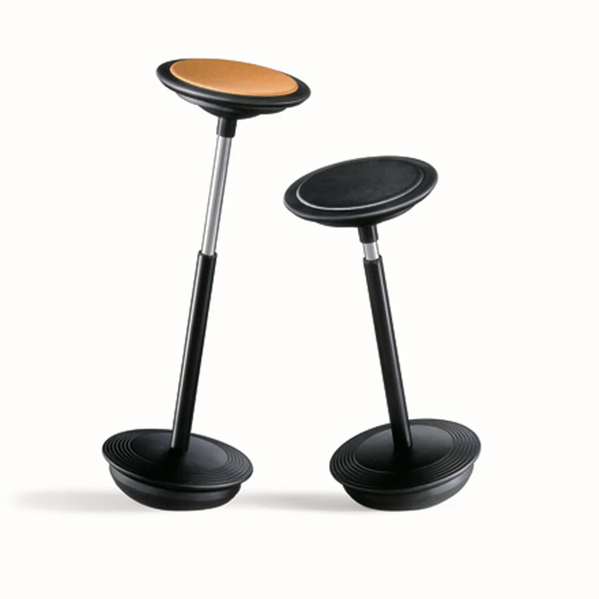 Die Stützhöhe lässt sich über einen Rundum-Griff unter der Sitzfläche stufenlos regulieren. Der Einbeiner steht auf einem mit Quarzsand gefüllten Fußbalg: So bleibt er auch standhaft, wenn er gerade nicht genutzt wird.