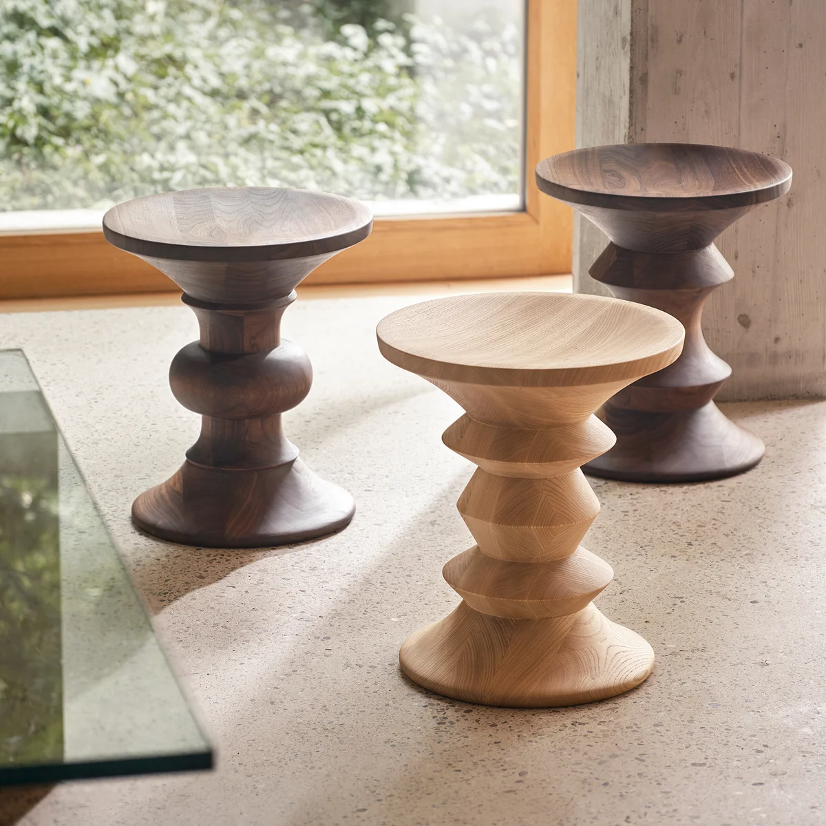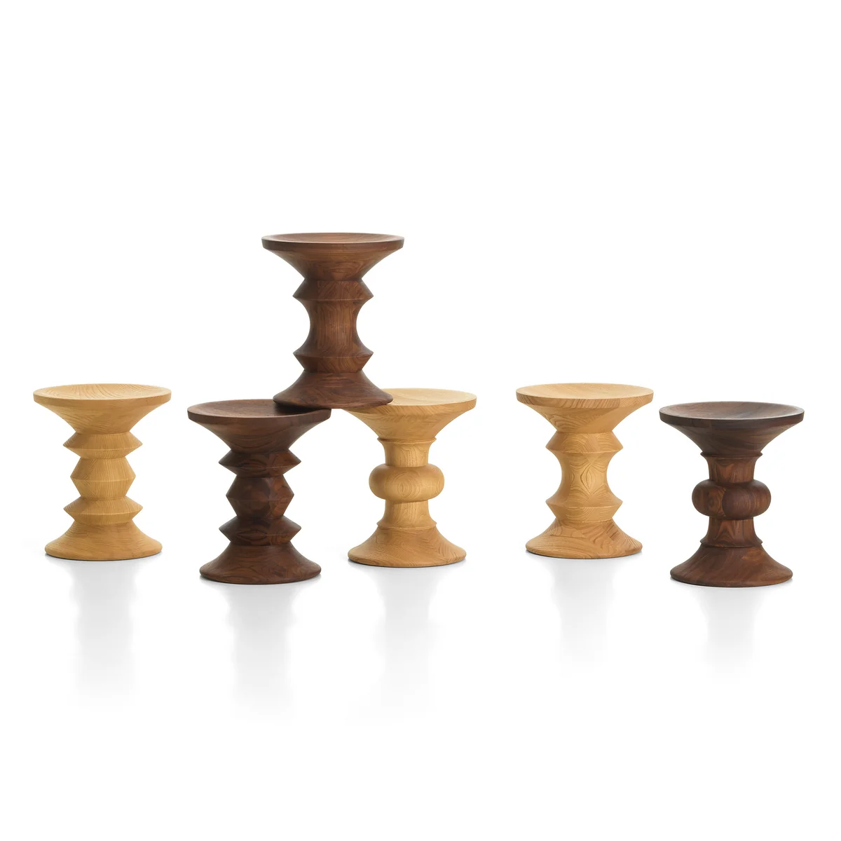 Der Eames Hocker wurde 1960 von Charles & Ray Eames entworfen. Der Hocker ist in drei Modellen erhältlich. Die Modelle unterschieden sich durch ihre unterschiedlichen Profile im Mittelteil. Jeder Hocker besteht aus massivem Nussbaumholz, das mehrlagig verleimt und klar lackiert ist. Die gedrechselten Hocker können je nach Wunsch auch als Beistelltisch genutzt werden.