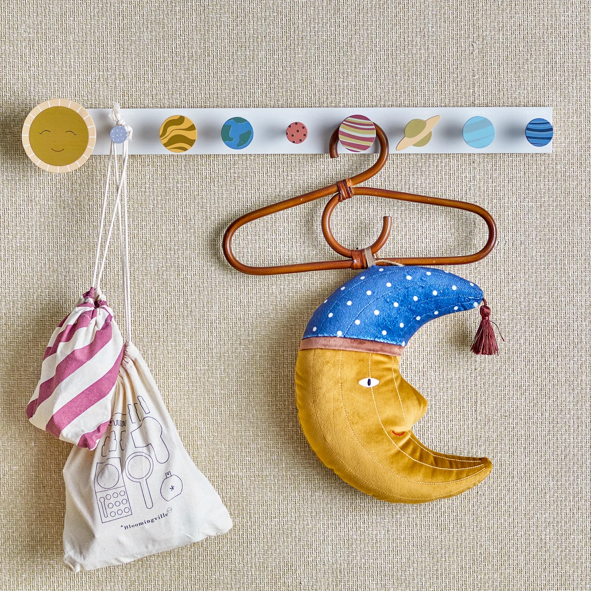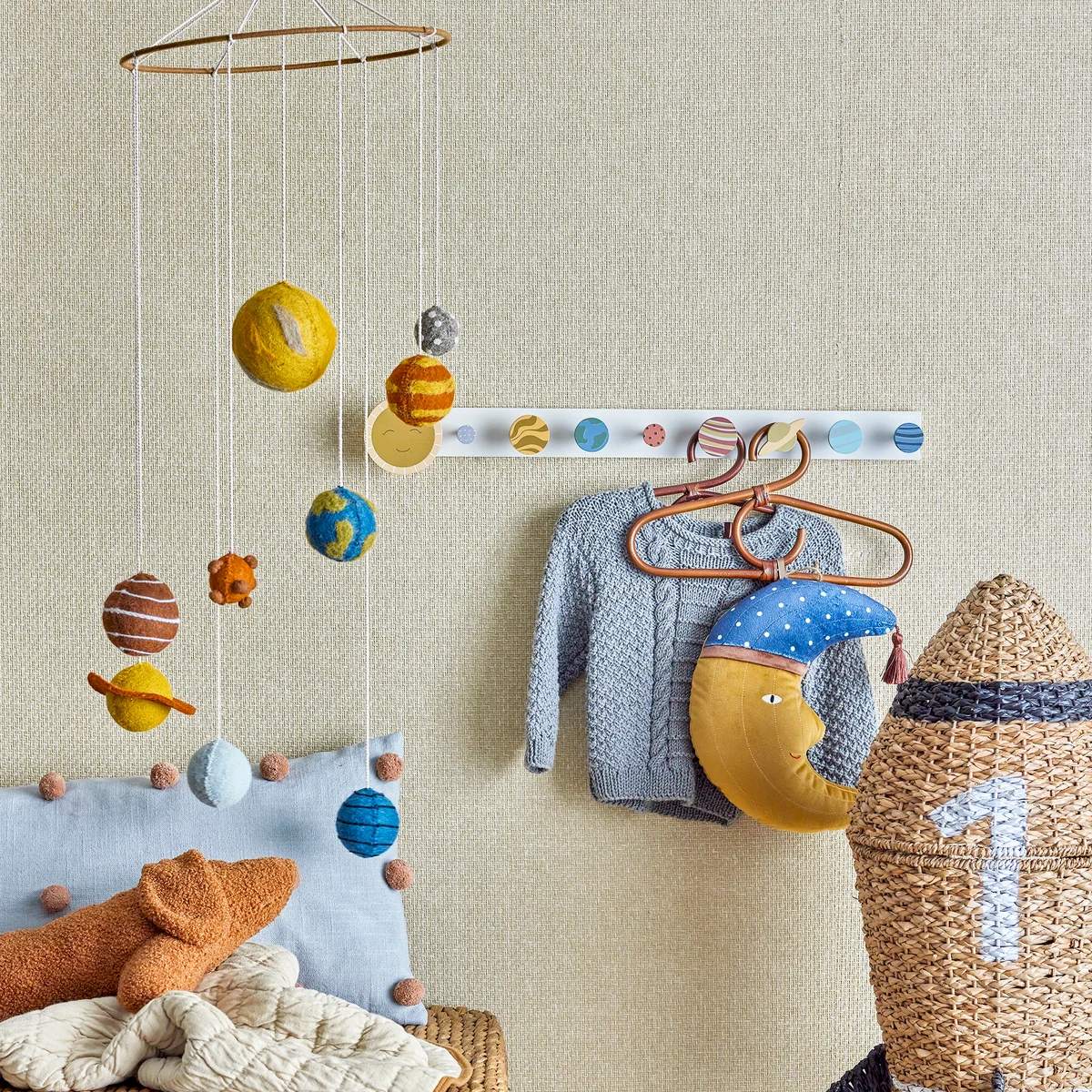 Die Space Hakenleiste von Bloomingville Mini ist ein einzigartiges Geschenk für neugierige Kinder und ein dekoratives Highlight für jedes Kinderzimmer. Diese Garderobe aus MDF-Holz zeigt unser faszinierendes Sonnensystem und verfügt über Haken mit den Namen der Planeten darüber. Dies ermöglicht es Kindern, auf spielerische Weise mehr über die Planeten zu erfahren, während sie gleichzeitig einen praktischen Ort haben, um ihre Jacken und Taschen aufzuhängen. Die Space Hakenleiste vereint spielerisches Lernen, Funktion und Ästhetik auf eine wunderbare Weise und trägt dazu bei, die Fantasie und den Wissensdurst der kleinen Entdecker zu fördern.