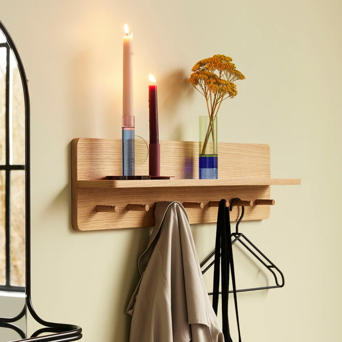 Der Kleiderhaken mit Regal von Hübsch Interior verbindet zwei Möbel zu einem praktischen Alleskönner! An der Unterseite befinden sich die Kleiderhaken, an denen sich Jacken, Mäntel, Taschen und weitere Kleidung aufhängen lässt. Direkt darüber befindet sich eine praktische Ablage, die sich für Dekoration, Blumen, oder kleine Alltagsgegenstände wie Schlüssel, Münzen und Brille eignet.