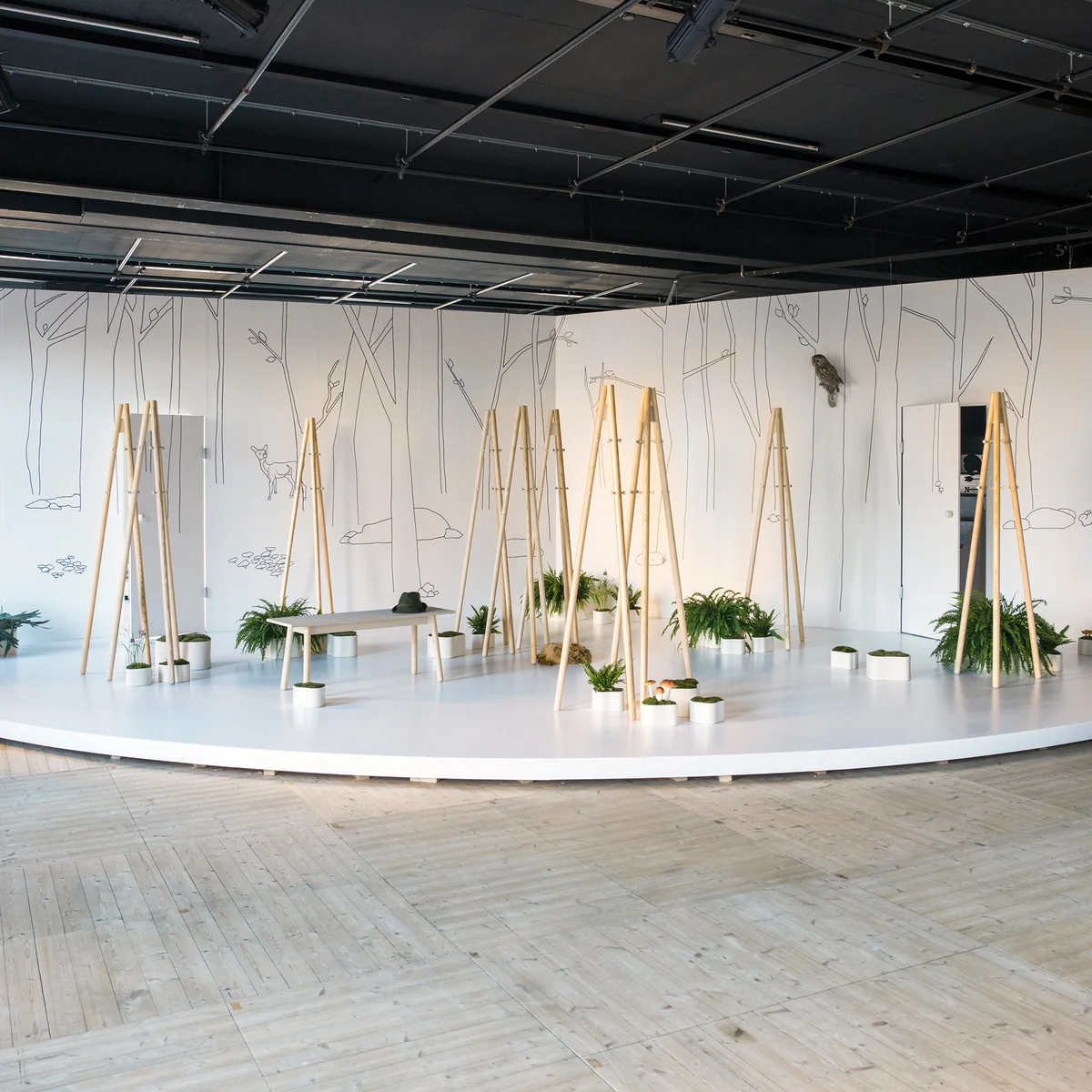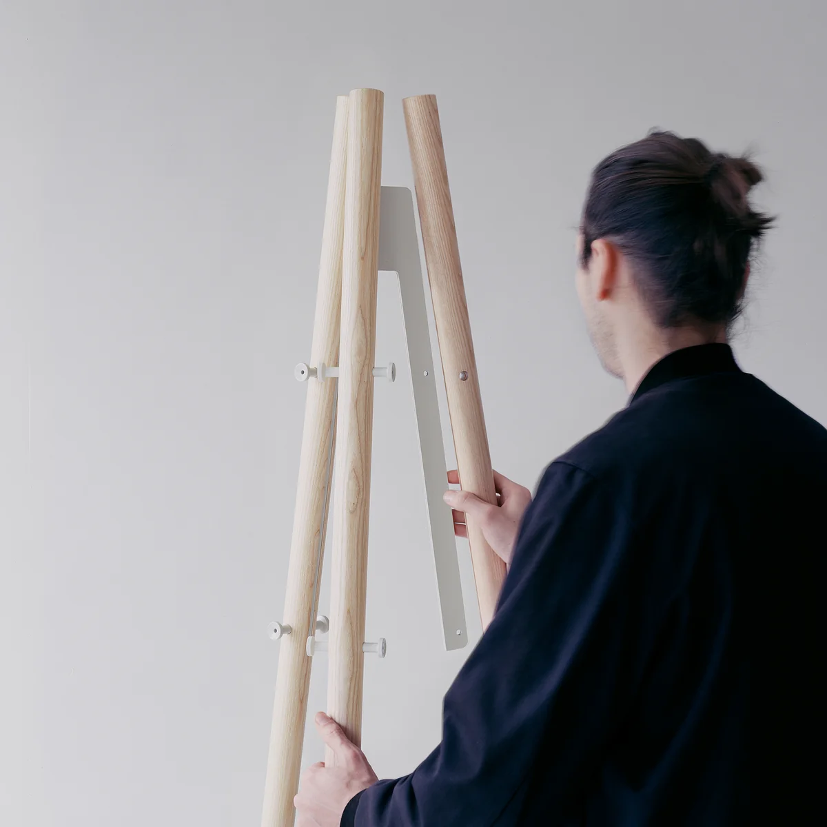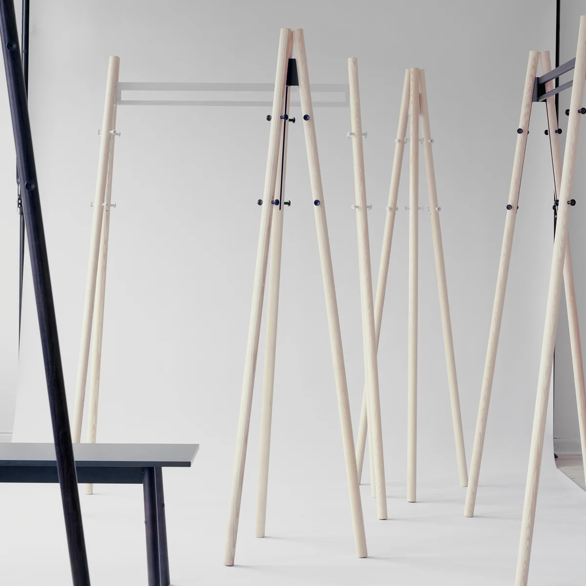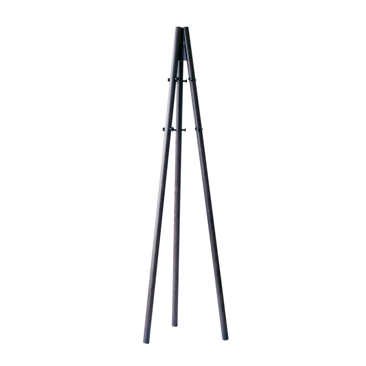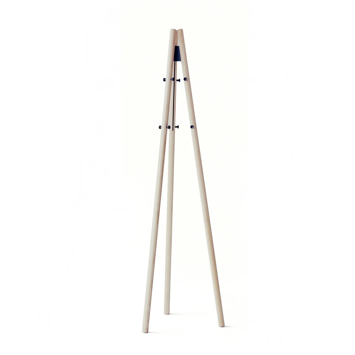 Die Konstruktion erinnert an ein Stativ und besteht aus einem keilförmigen, pulverbeschichtetem Metallgelenk, auf das drei schlanke Eschenholzbeine montiert sind. Sie sind mit Metallstiften verschraubt, die leicht herausragen und so gleichzeitig als Kleiderhaken dienen. Rybakken hat bewusst alle Aspekte der Konstruktion sichtbar gemacht und damit ein transparentes Design geschaffen, das dem Nutzer nichts verborgen hält. Seine Arbeit lässt sich als Hommage an den berühmten finnischen Designer Alvar Aalto und die teils erkennbare Ursprünglichkeit in seinen Entwürfen verstehen.