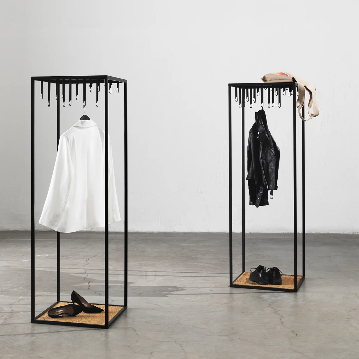 Die 170 cm hohe Garderobe ist zudem in einigen Modehäusern zu finden, in denen sie die neusten Fashion-Teile auf besondere Weise präsentiert. Auch im Büro, in der Hotel-Lobby oder im Restaurant lässt sich die Atelier Garderobe von Design House Stockholm wunderbar einsetzen. Der Boden ist mit einer natürlichen Kokosmatte bedeckt, auf der beispielsweise Schuhe abgestellt werden können. Das Gestell der Atelier Garderobe ist aus pulverbeschichtetem Eisen gefertigt.
