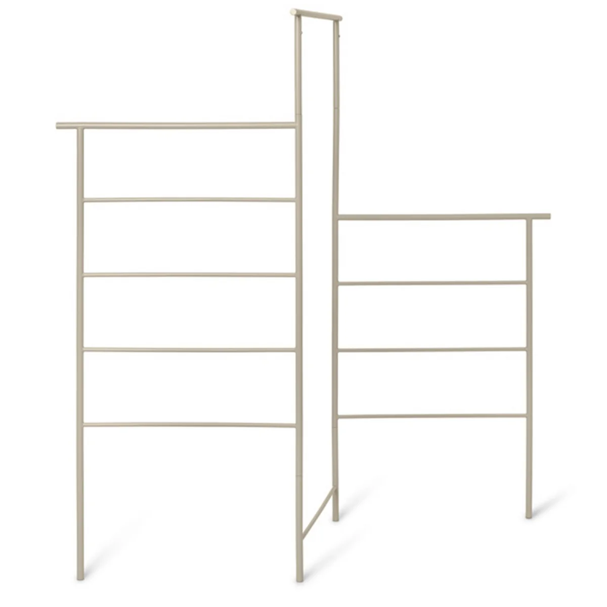 Der Dora Kleiderständer besteht aus drei Paneelen aus glattem, pulverbeschichtetem Metall und ist eine minimalistische Aufbewahrungslösung mit einem Hauch japanischer Ästhetik. Während an dem Mittelteil Kleiderbügel und Haken einen Platz finden, können über die Streben an den Außenteilen Handtücher, Schals und vieles mehr gehängt werden.