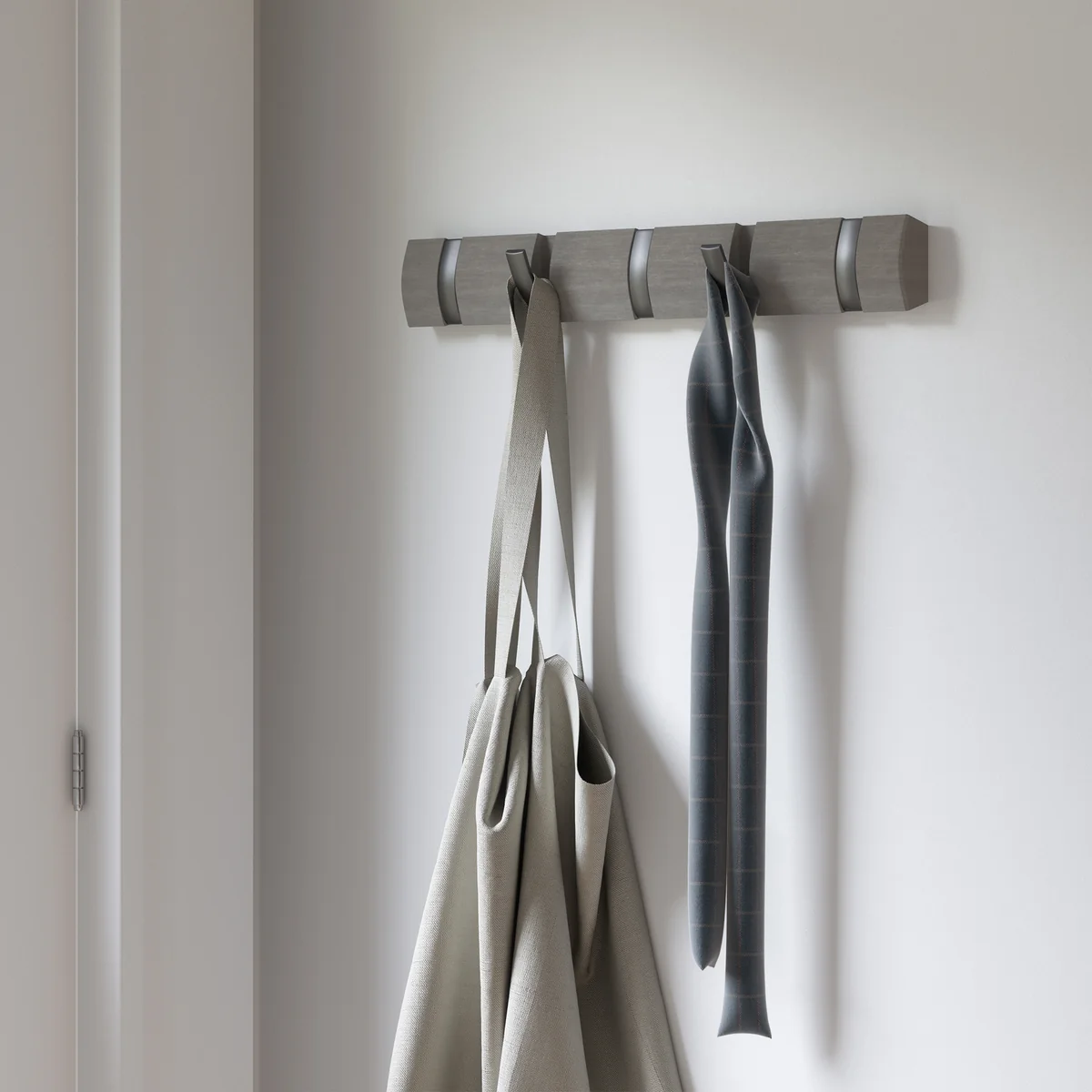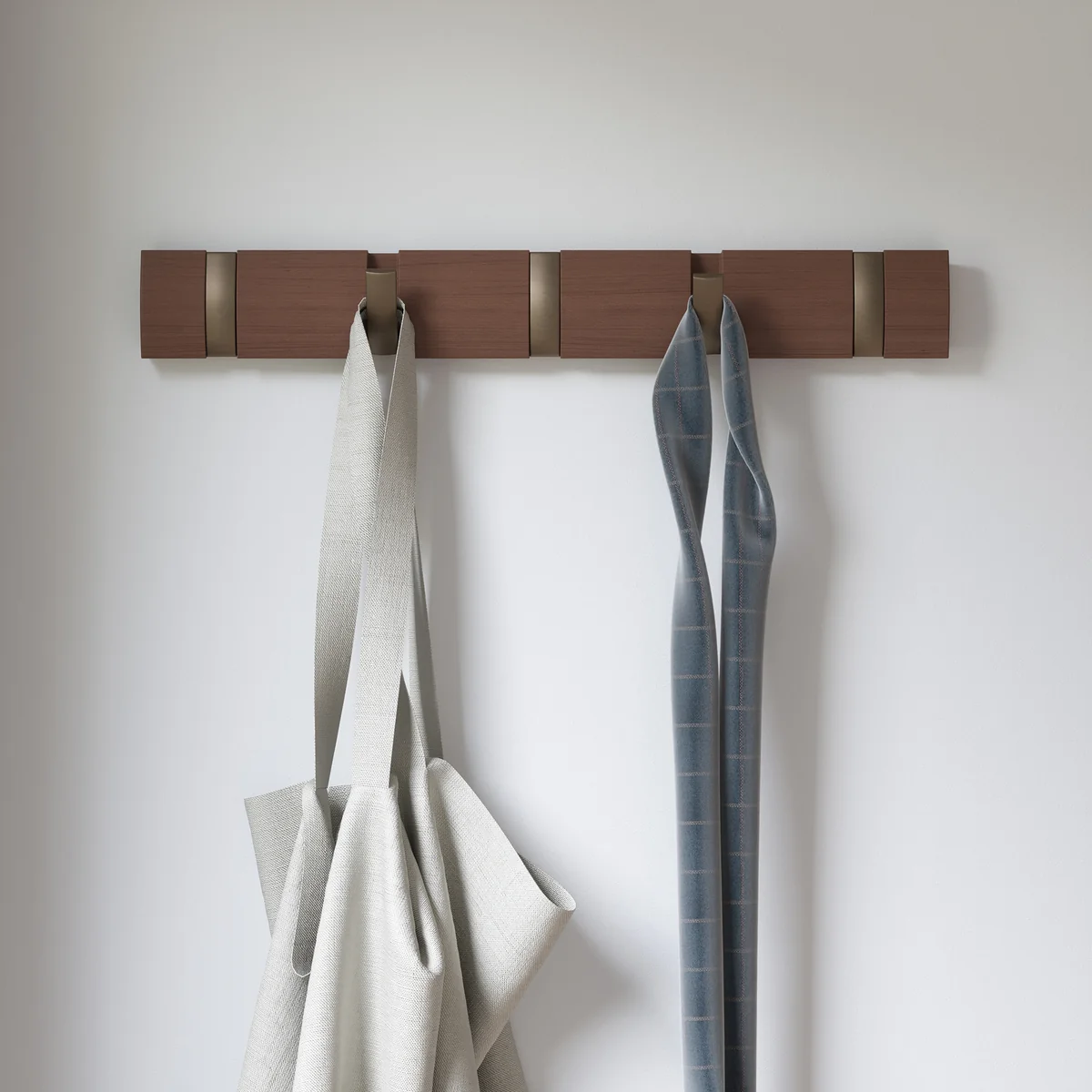 Ersetzen Sie Ihre Kleiderbügel und -haken durch die stilvolle Flip Garderobe! Attraktiv, stilvoll und praktisch! Die Flip Hook 5er Garderobenleiste von Umbra lässt sich schnell und einfach an jede Wand montieren und ist sofort einsatzbereit. Die Flip Garderobe besteht aus lackiertem Hartholz und fünf nickelbeschichteten Haken.