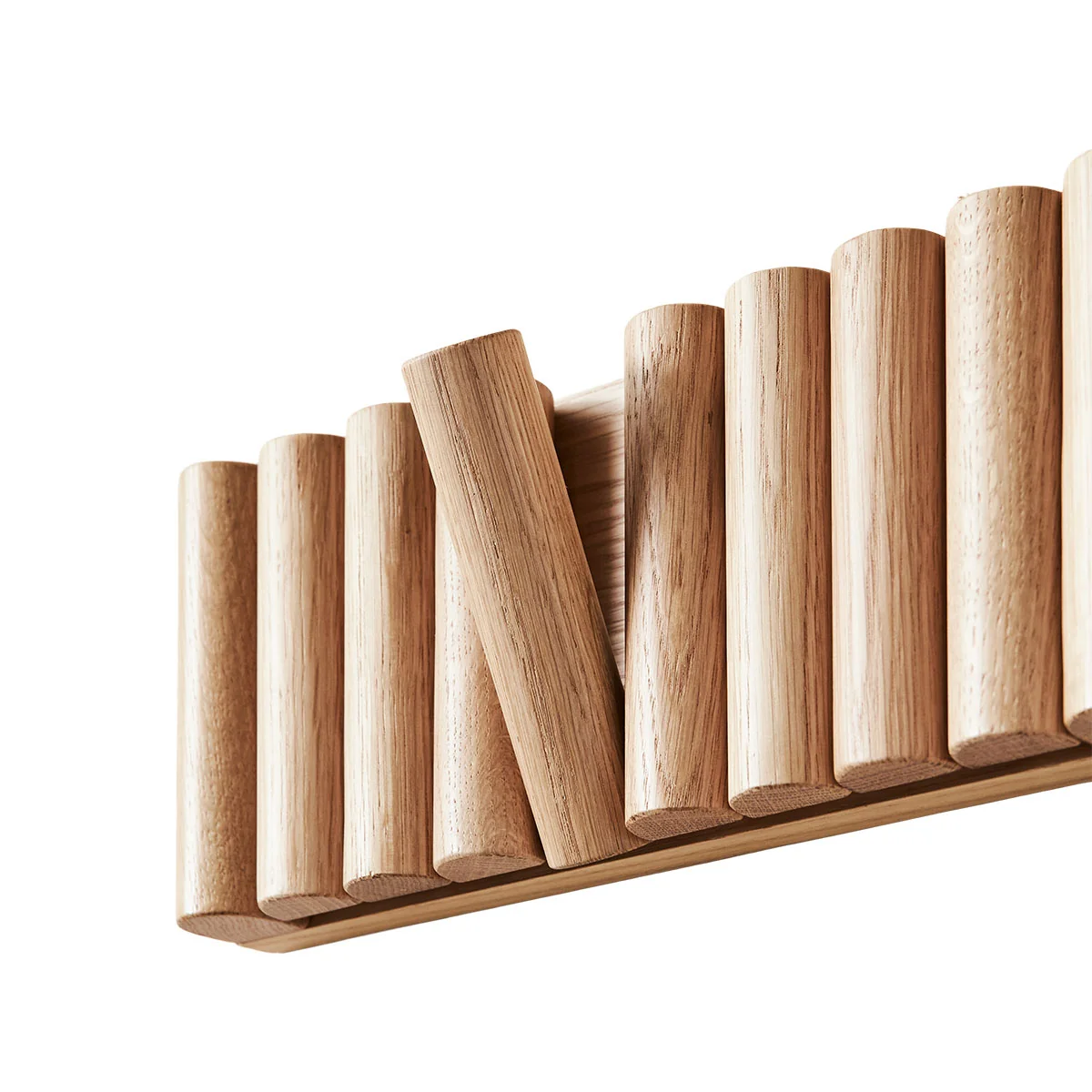 Die Mono Wandgarderobe von Andersen Furniture ist ein Zeugnis der Schlichtheit und Eleganz, gefertigt aus massiver Eiche. Sein Design verkörpert eine minimalistische Ästhetik, wobei die helle Eichenoberfläche jedem Innenraum ein Gefühl von Wärme und Ausstrahlung verleiht. Die Garderobe verfügt über mehrere Haken in einer einzigen Einheit und erleichtert das Aufhängen von Oberbekleidung und Kleiderbügeln, indem man einfach einen der Haken nach unten kippt.