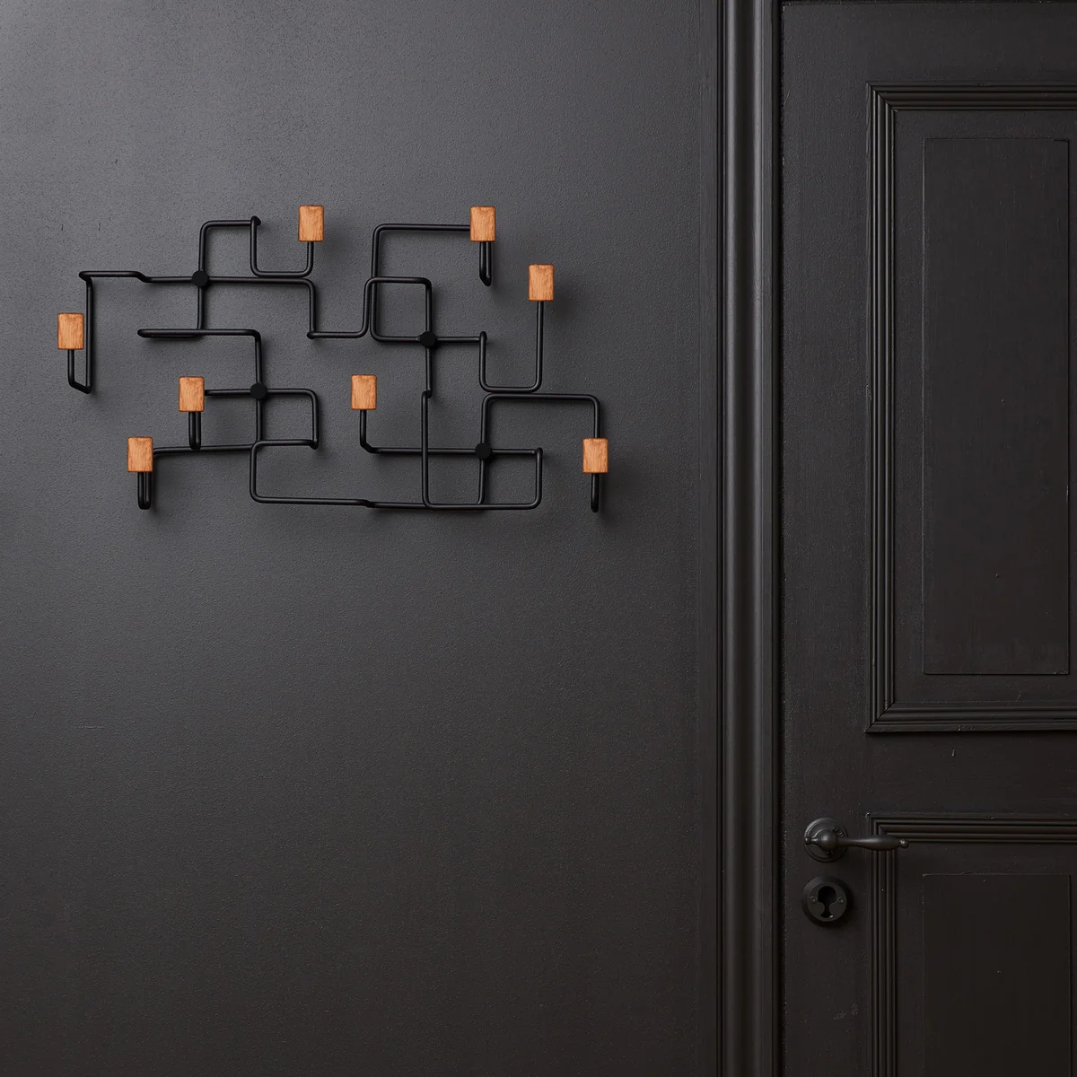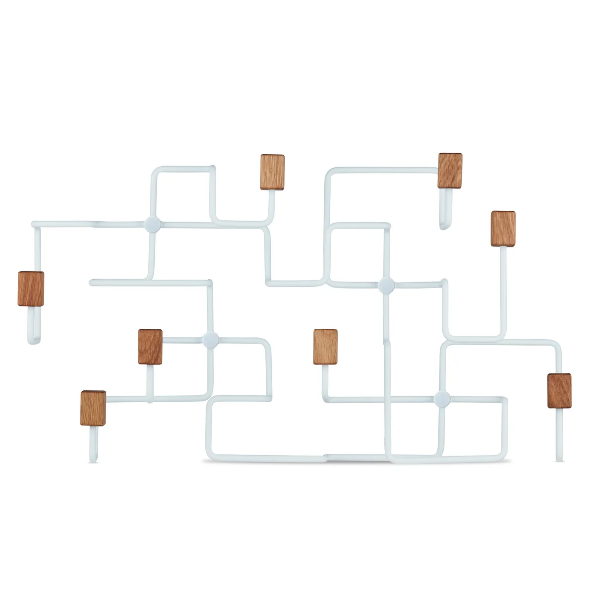 An den 'Endstationen' befinden sich insgesamt acht Holzhaken, an denen Mäntel, Taschen und Schals einen Platz finden können. Wird die Underground Wandgarderobe im Badezimmer genutzt, können auch Handtücher daran aufgehängt werden.